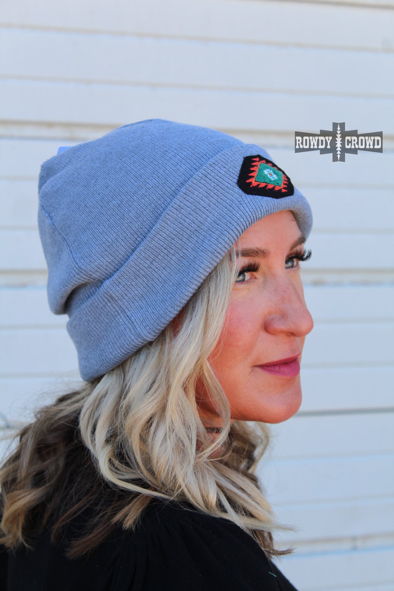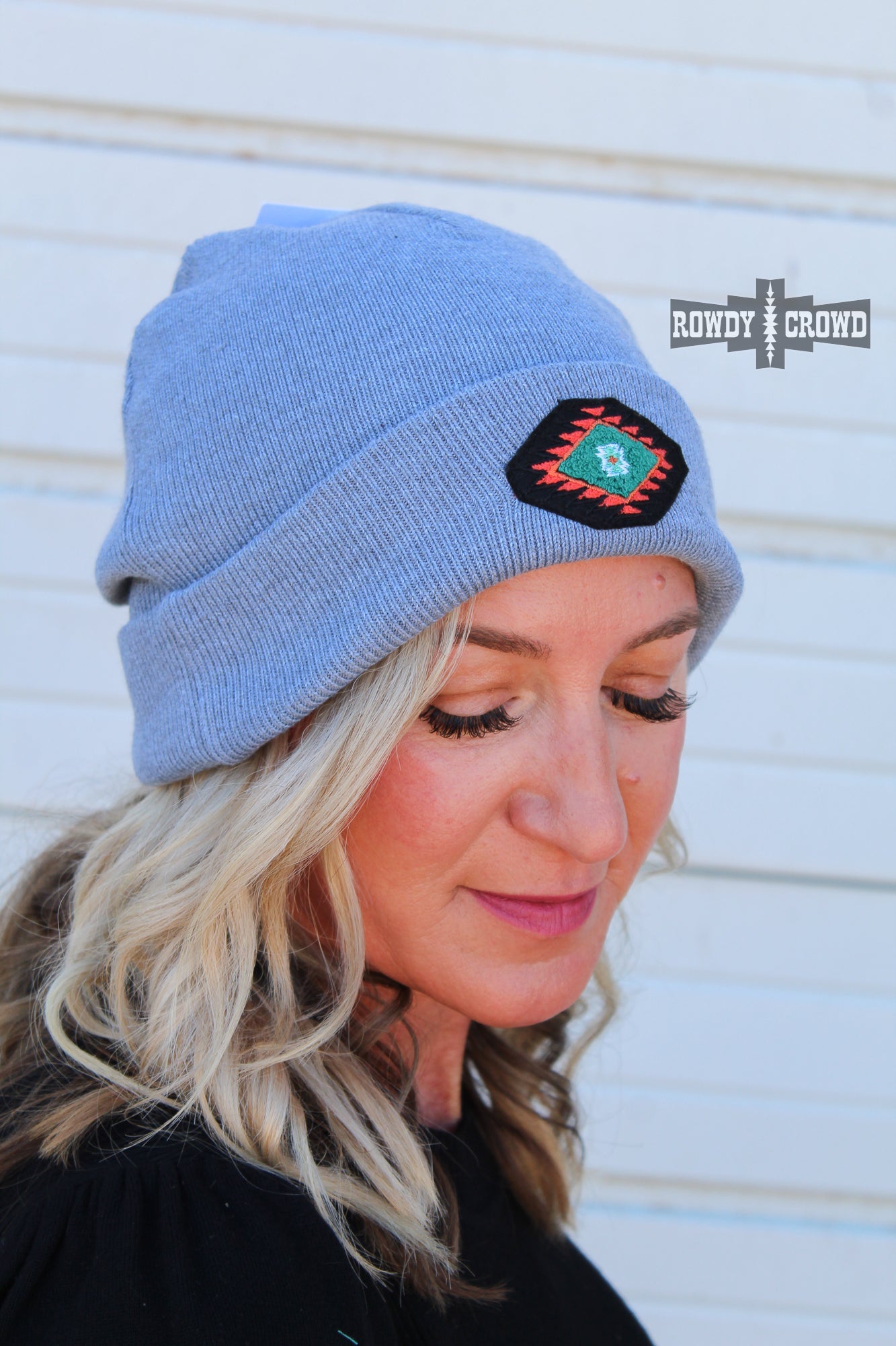 Crafted from cozy grey fabric, the Alvarado Aztec Beanie features a bold black, orange, teal, and white aztec design in the front, adding a touch of personality to any outfit. Stay warm and chic in style!