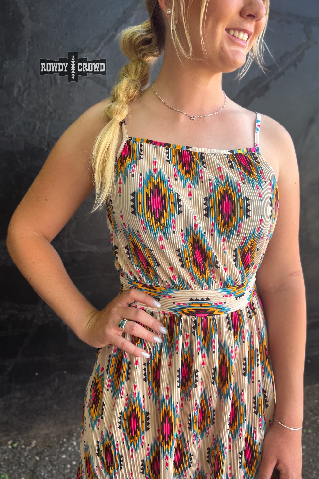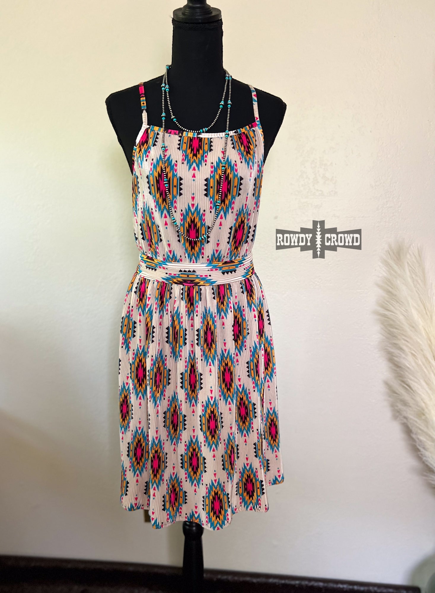 The Aztec River dress features a bold and eye-catching aztec print, perfect for making a statement. With its lightweight and flowy fabric, it is effortless to wear. The spaghetti straps add a touch of femininity and make it a great option for warm weather. Upgrade your wardrobe with this versatile piece! True to size, with a zipper on the back. This dress is easy to take care of, and is very easy to dress!