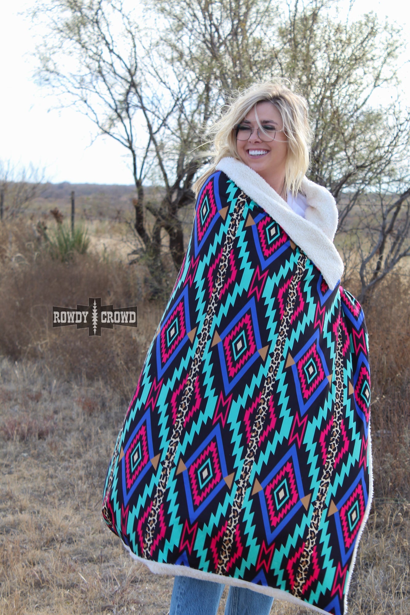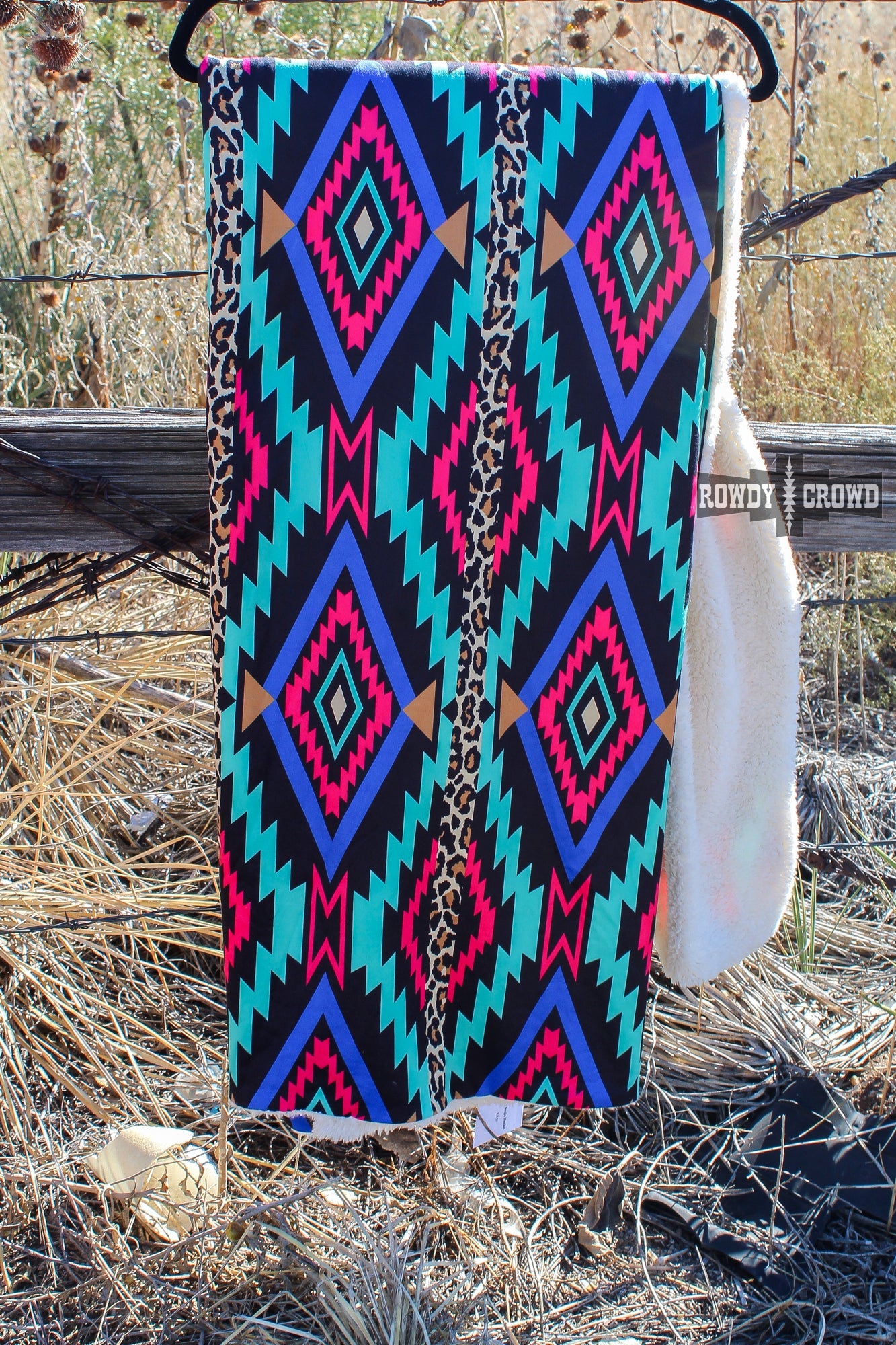 Snuggle up in luxury with the Bad & Boujie Blanket! This designer throw blanket is made with ultra-soft fabric and decorated with vibrant teal, pink, purple and yellow Aztec patterns on a black background with cheetah stripes running horizontally. Its eye-catching design and cozy warmth will be sure to add some style, comfort and joy to your space. This blanket is easy to take care of, and the fabric is great quality. Wrap yourself in warmth with the Bad & Boujie Blanket!