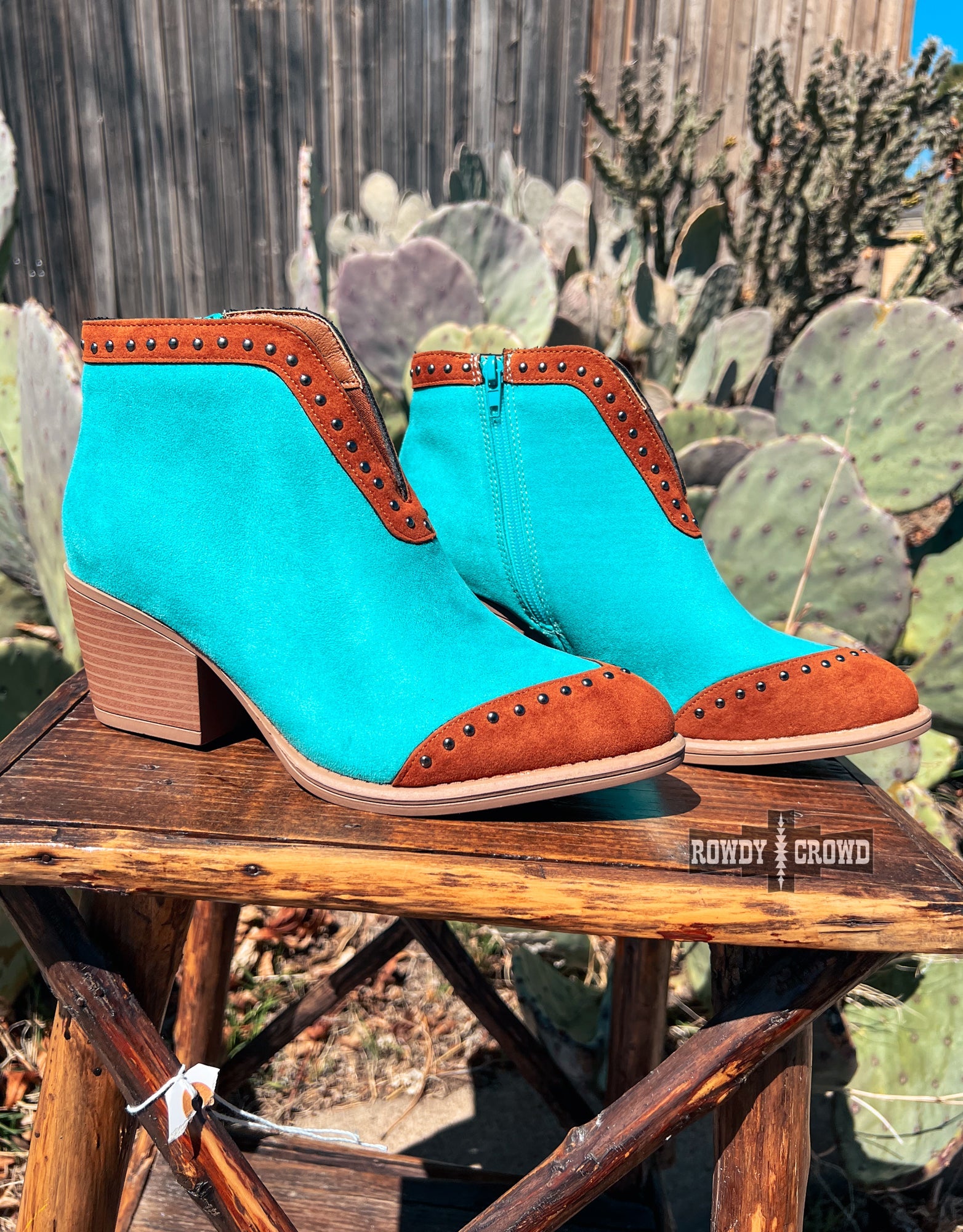Step out in style with the western Beaumont Booties! Crafted from luxe teal suede, these booties feature a chic v-cut in the front and are lined with rich brown suede. Sparkly stud detailing adds the perfect touch of glamour. Make a fashion statement with these must-have booties!