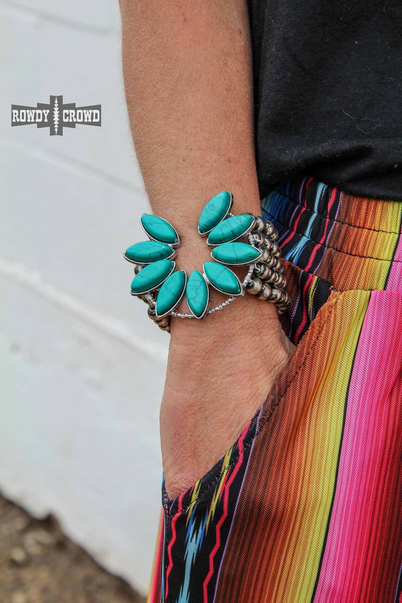 Adorn yourself with beauty and style! The Blue Blossom Bracelet features 5 strands of shimmering silver beads, stylishly intertwined with a semi-circle of stunning turquoise petal shapes. Show off your unique personality with this one-of-a-kind piece!