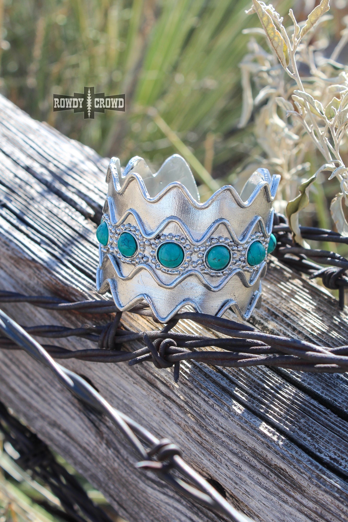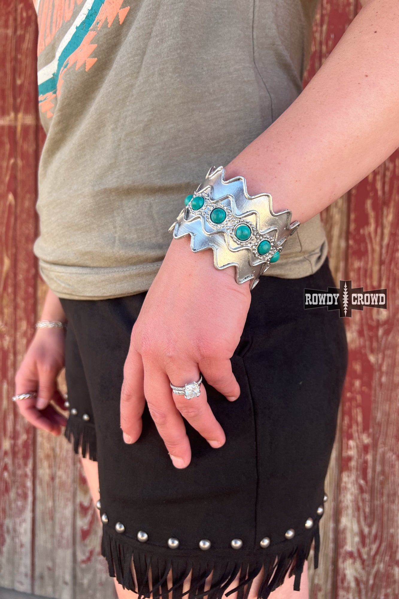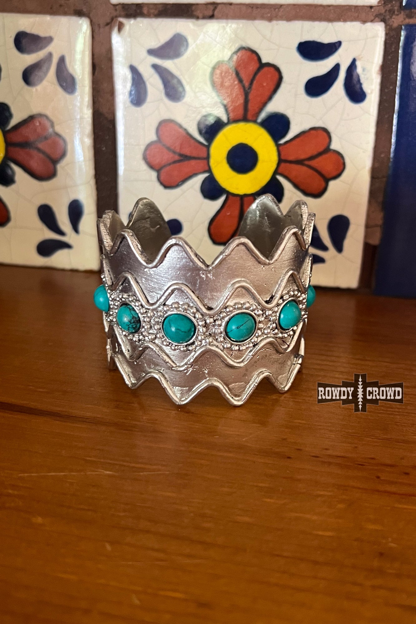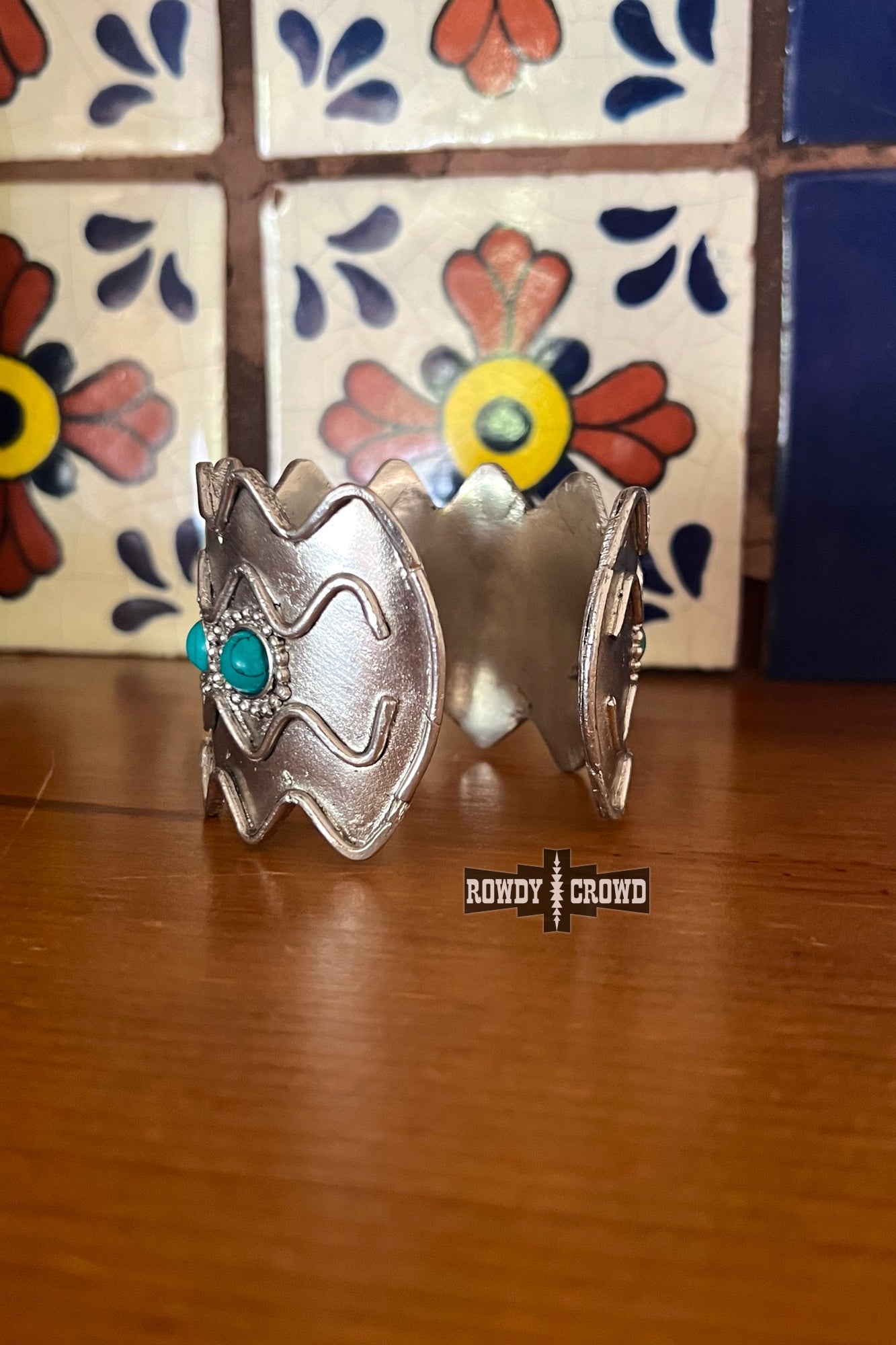 Make a statement with the Cleo Cuff! This one-of-a-kind silver cuff is beautifully crafted with captivating wave-like borders and round turquoise stones that add a unique touch. Can be adjusted to fit any size wrist!