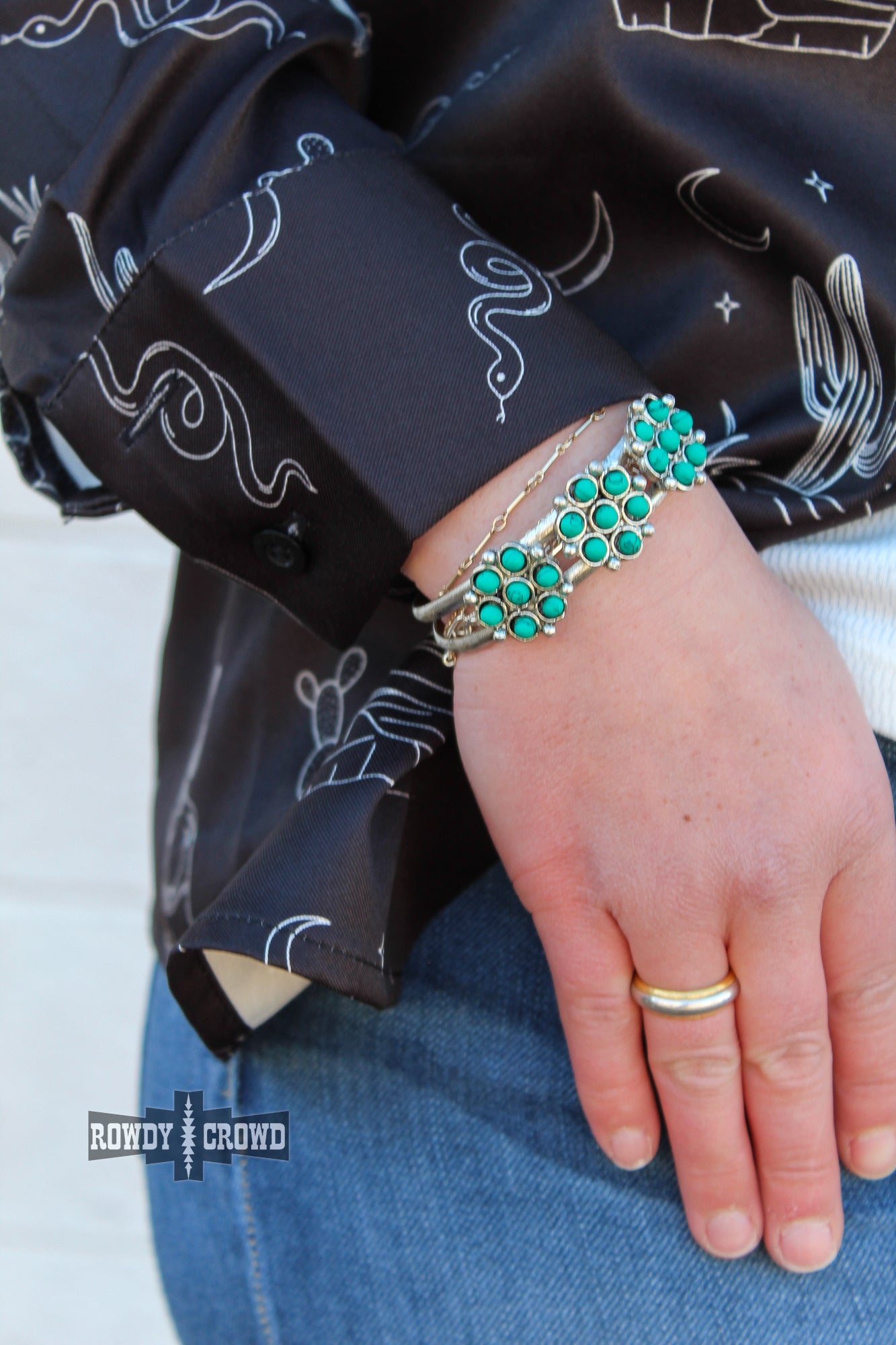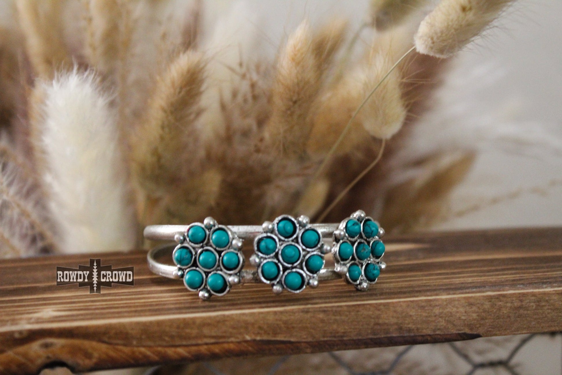 This silver cuff features three exquisite turquoise flowers, each meticulously crafted from a cluster of seven turquoise beads. What makes this cuff truly special is its adjustable design, allowing you to find the perfect fit for your wrist. Whether you wear it as a standalone statement piece or pair it with other accessories, this cuff is the embodiment of both style and comfort.
