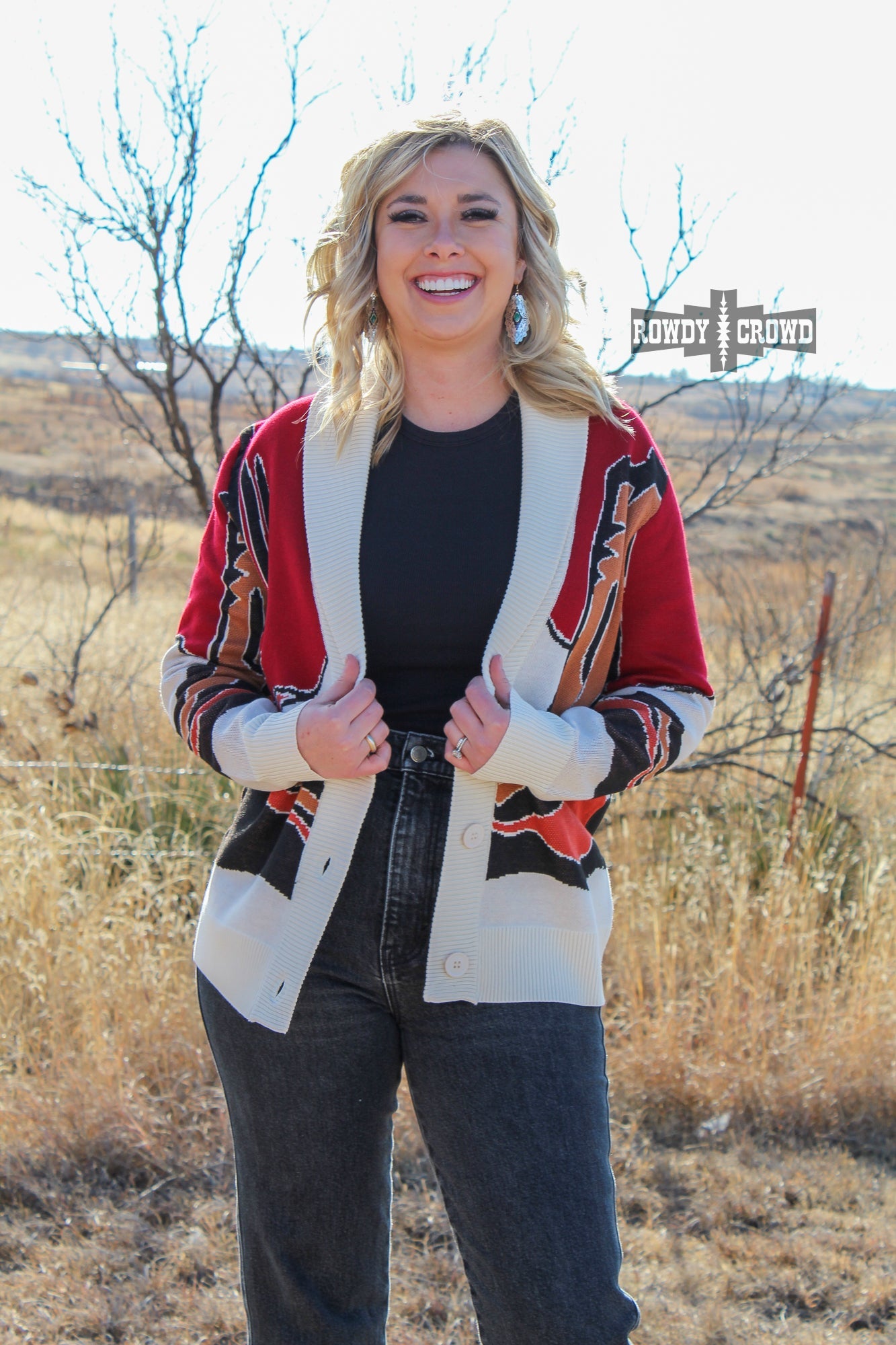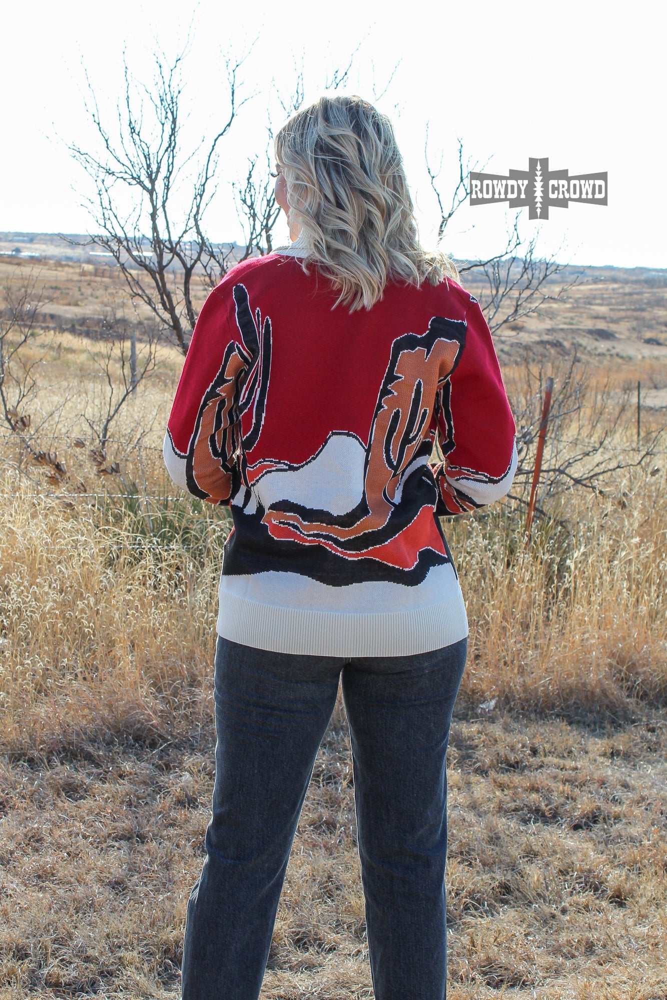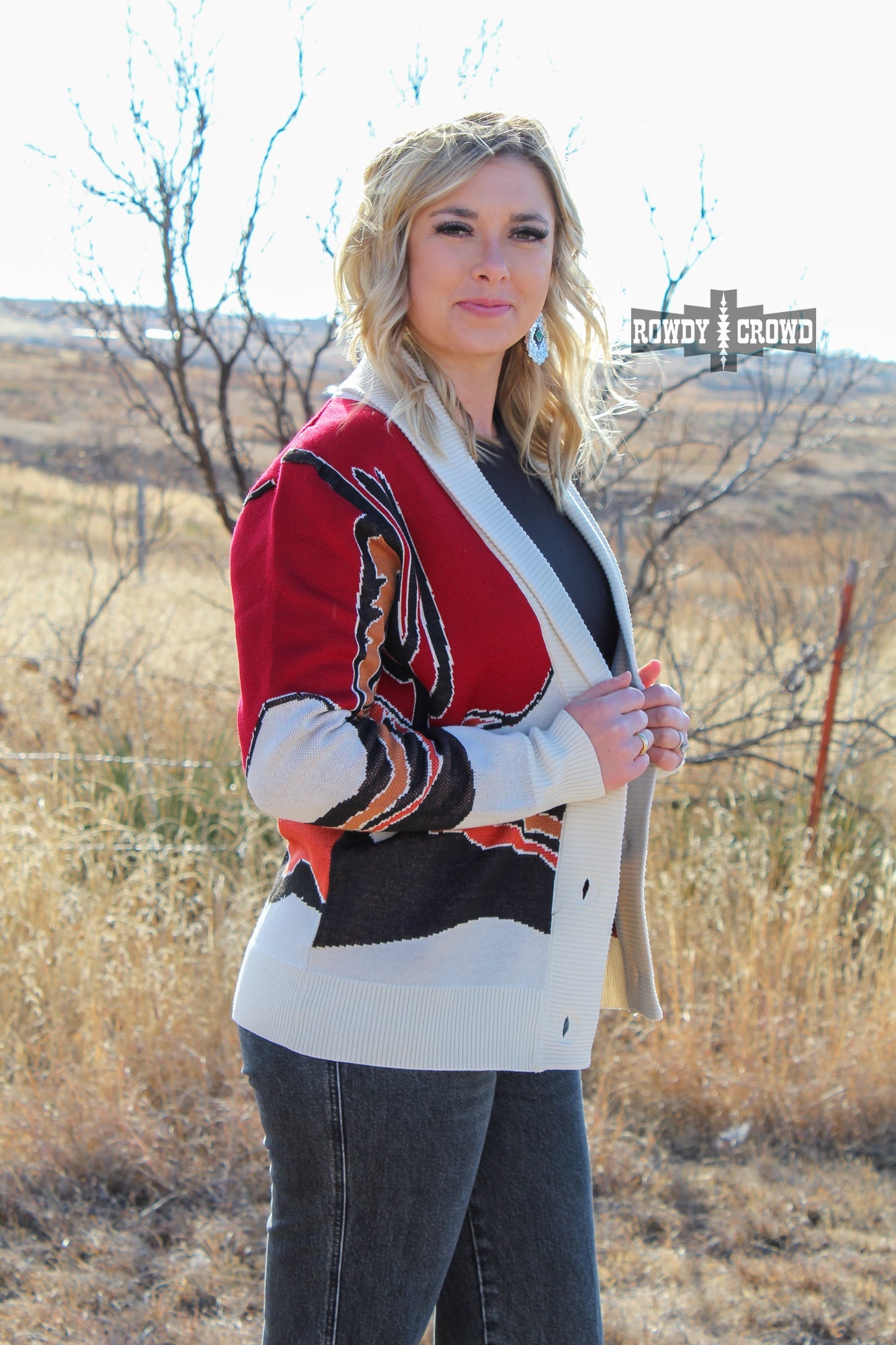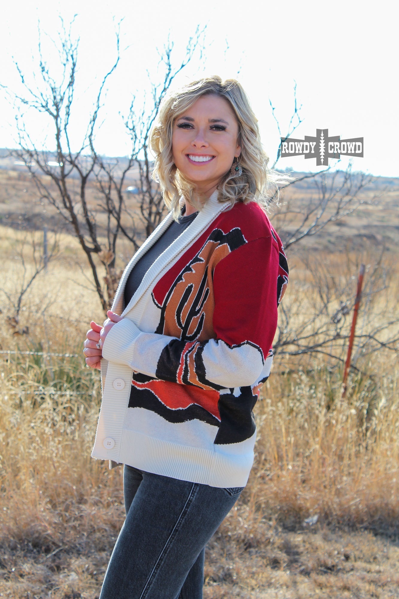 Discover the perfect layering piece for your Western wardrobe with the Cowpoke Cardigan! Styled with a stunning desert landscape in red, brown, black, and cream, the cardigan is complete with a cream collar, cuffs and bottom. Feel warm and comfortable while looking your best!