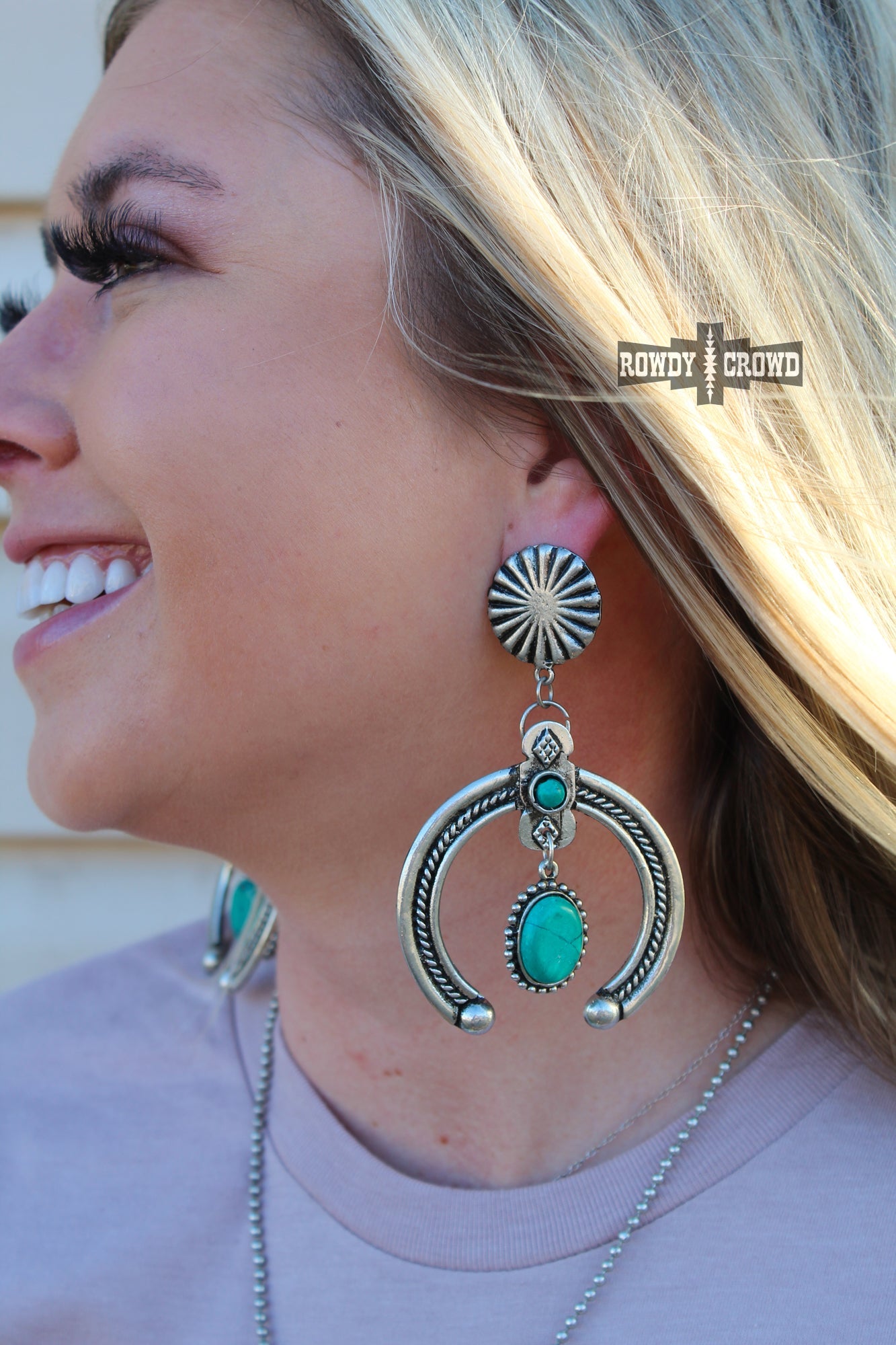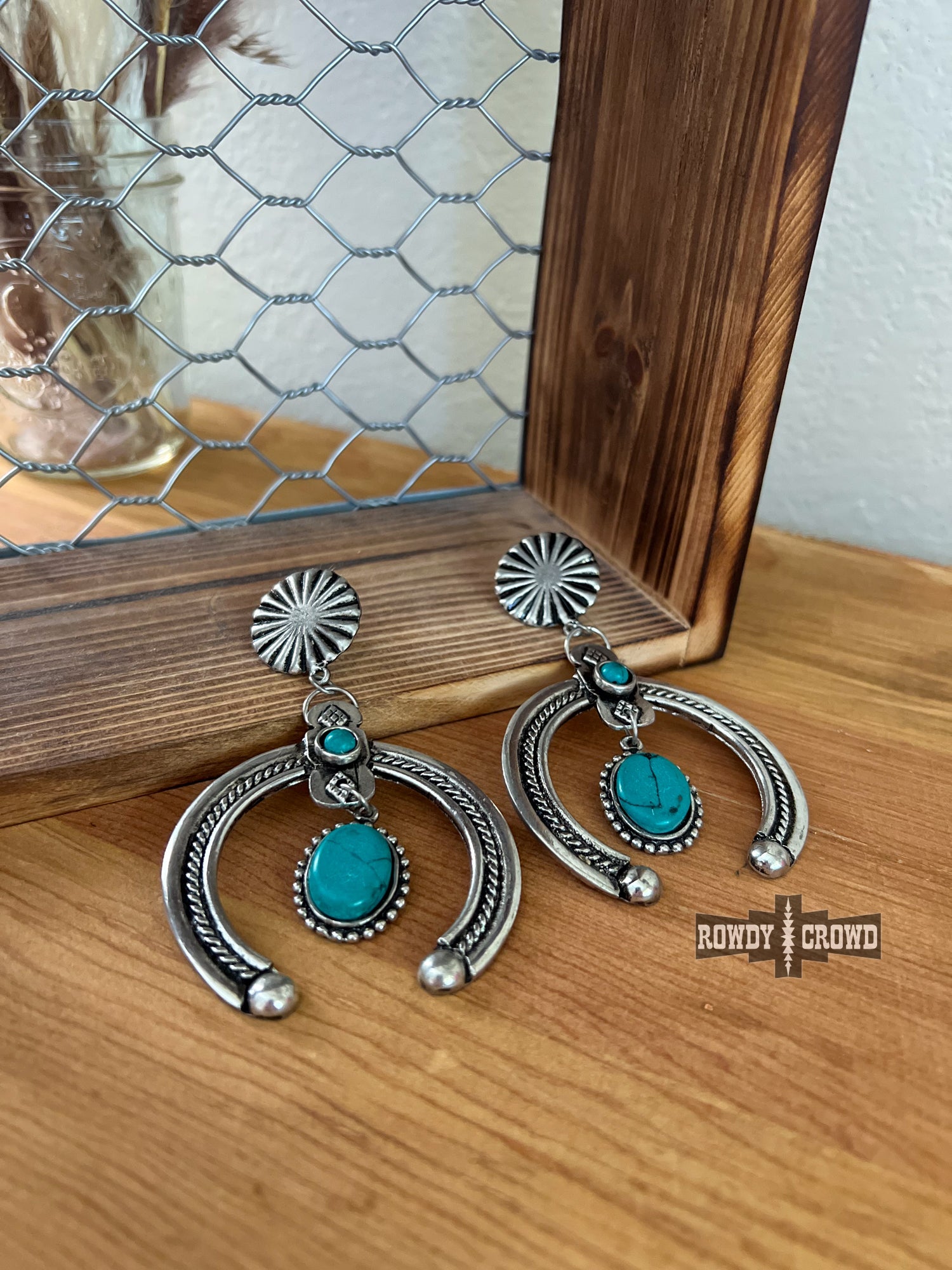 Our Deep Ellum Earrings feature a circle stud, adorned with a silver semi-circle with rope detailing. Cascading gracefully from the semi-circle, a captivating turquoise drop surrounded by silver adds a touch of western elegance and movement.