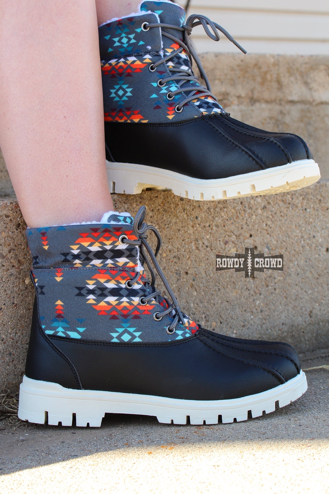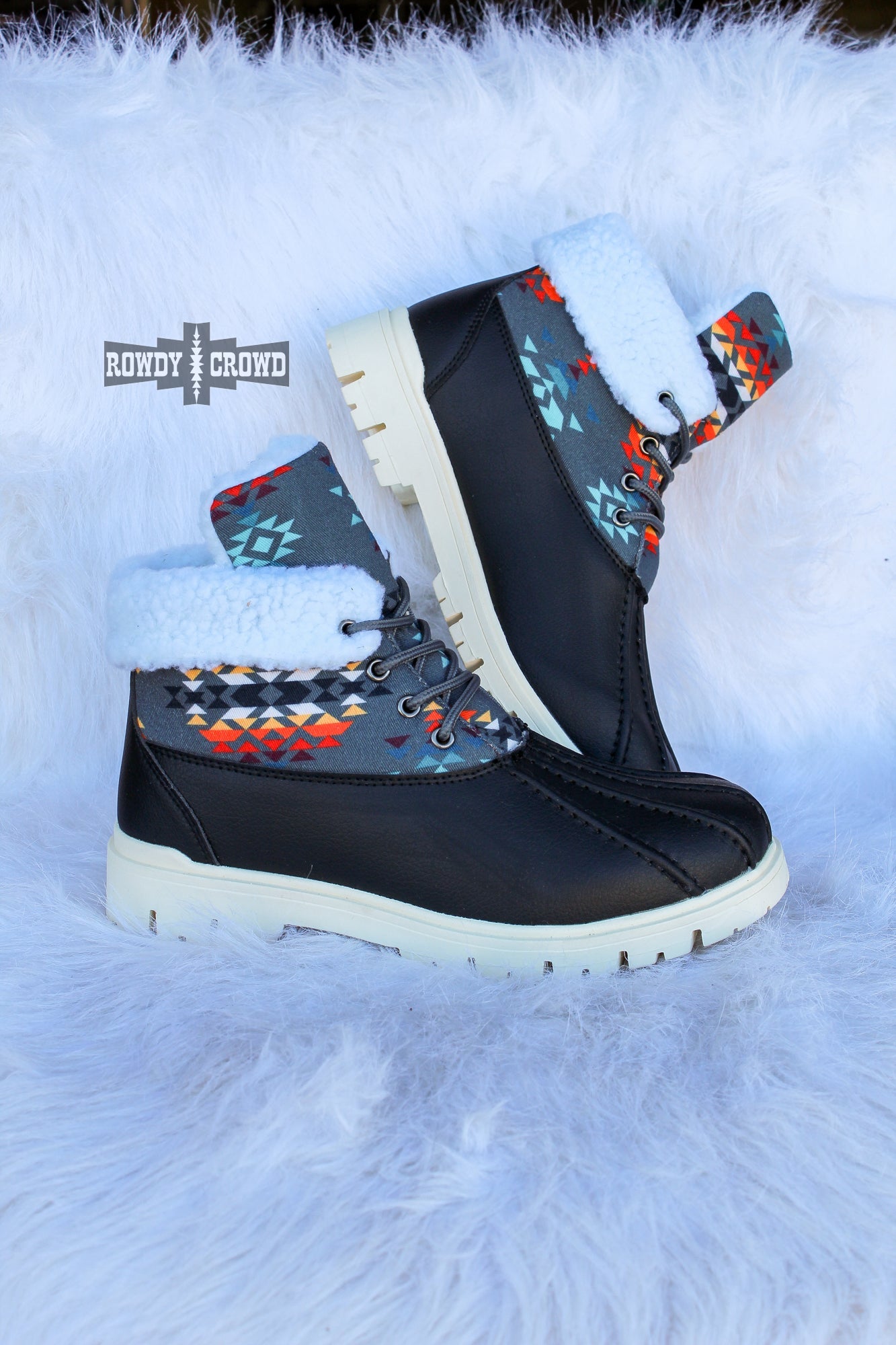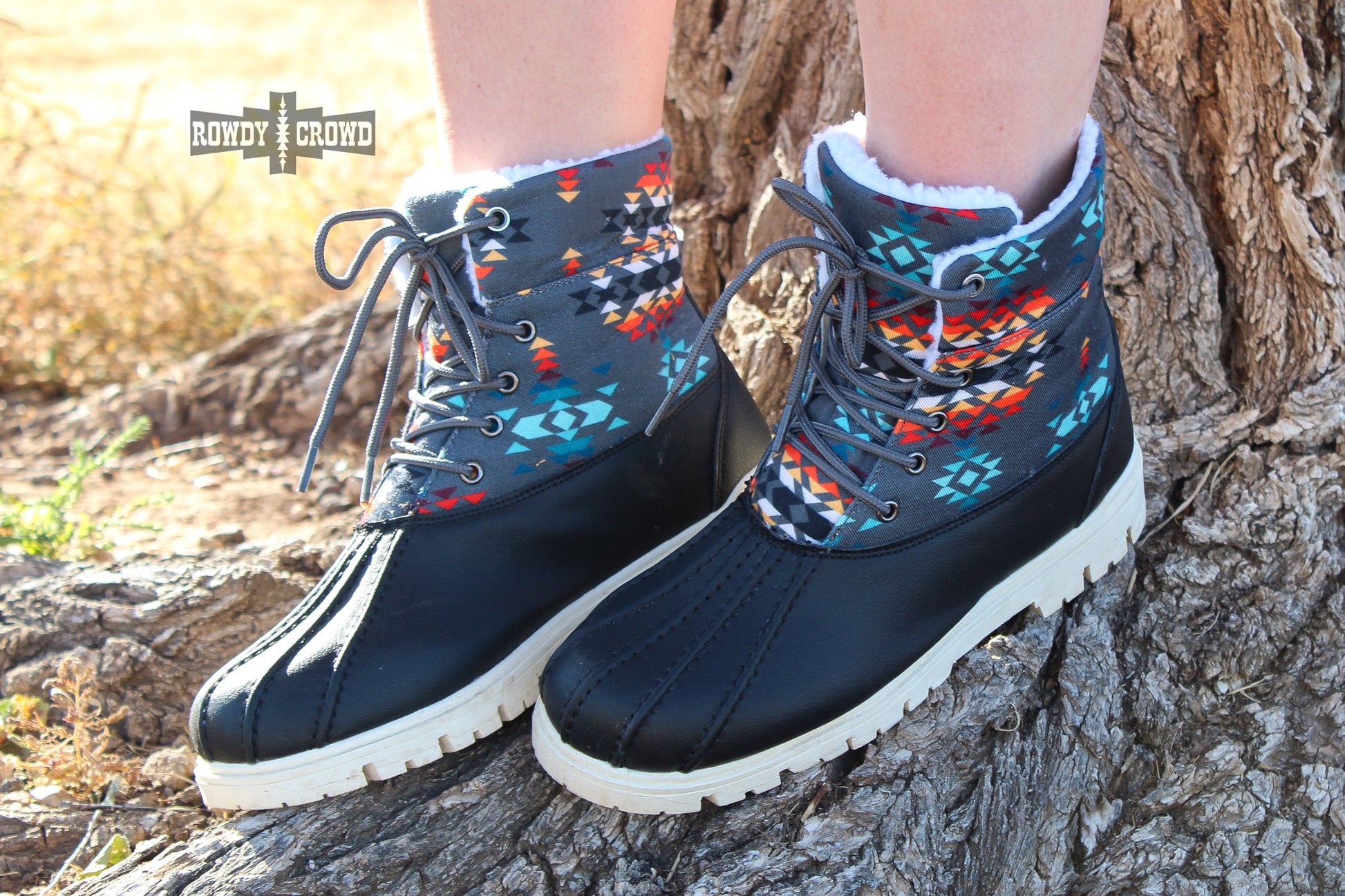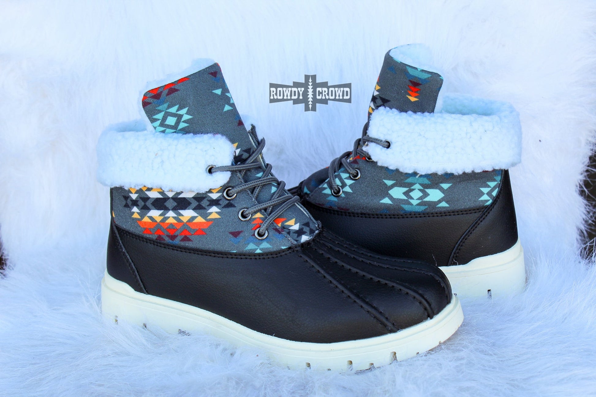 Experience the warmth and comfort of the western Down Canyon Duck Boots. Crafted with black leather and a gray Aztec top, they are perfect for cold, wet weather. White fur lining adds coziness and charm while the laces offer a secure fit. Make a splash on your next outing!