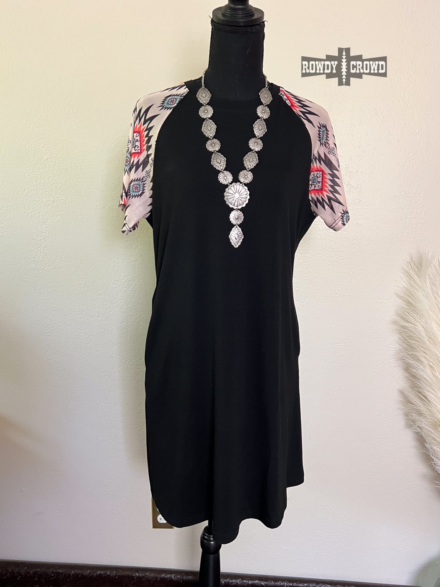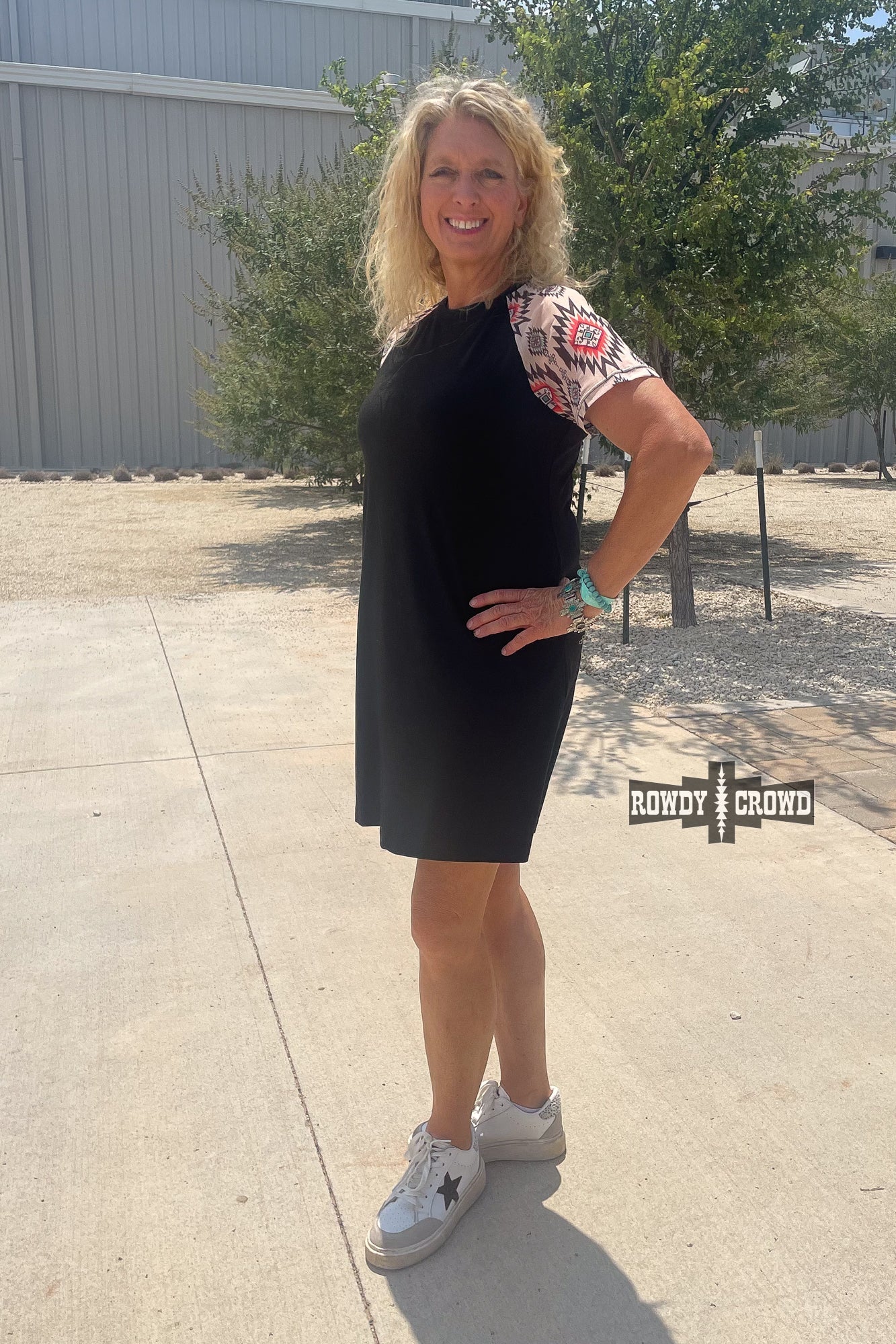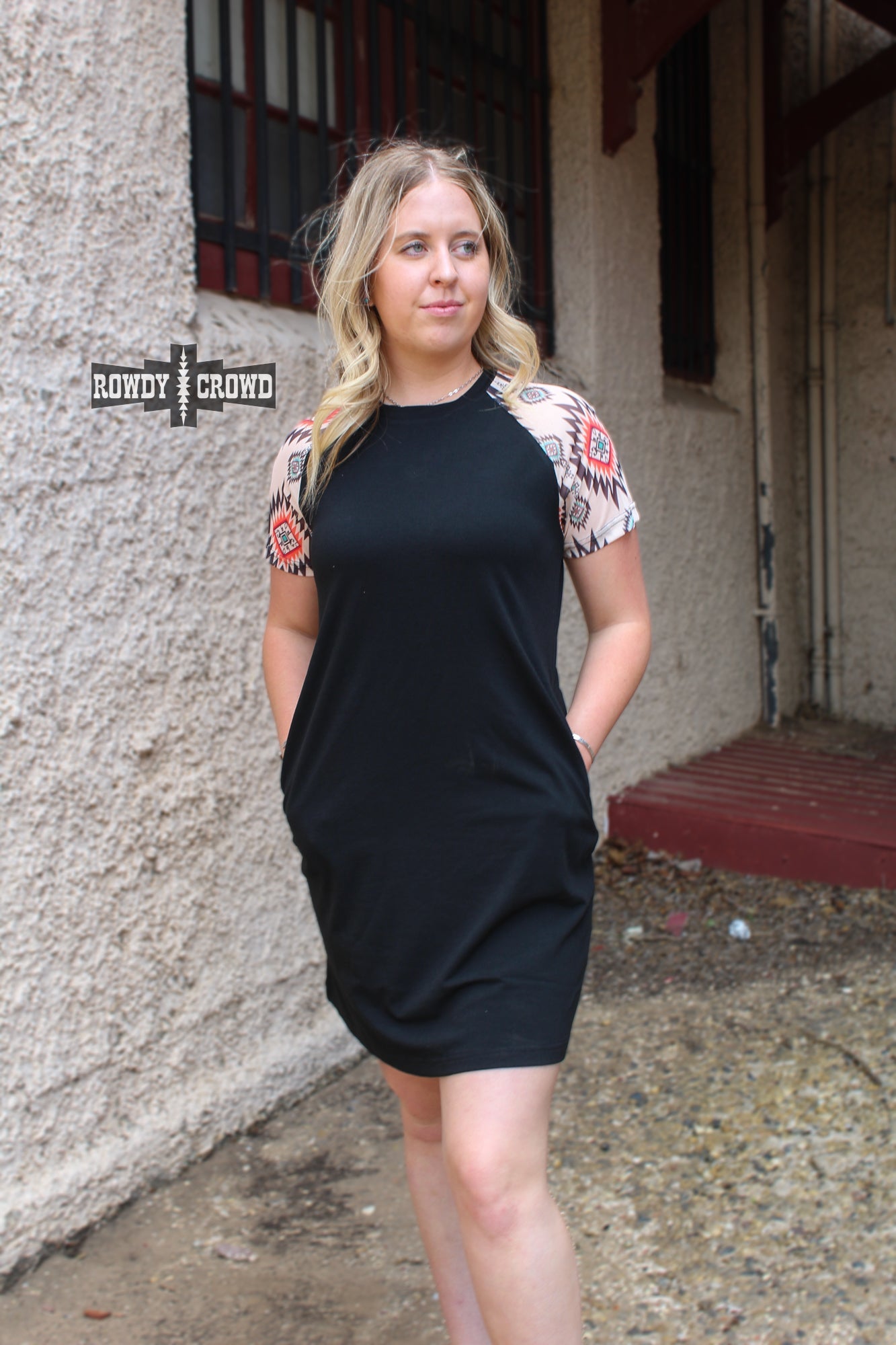 Step into our Down Home Dress! Its sleek black design is accentuated by striking mesh aztec sleeves, while the perfect length ensures a flattering fit. Not only is it cute, but it's also incredibly comfortable, and has POCKETS! Comes in plus sizes as well, S-3XL, and is a true to size fit. This dress is very easy to take care of, and can be worn for any occasion!