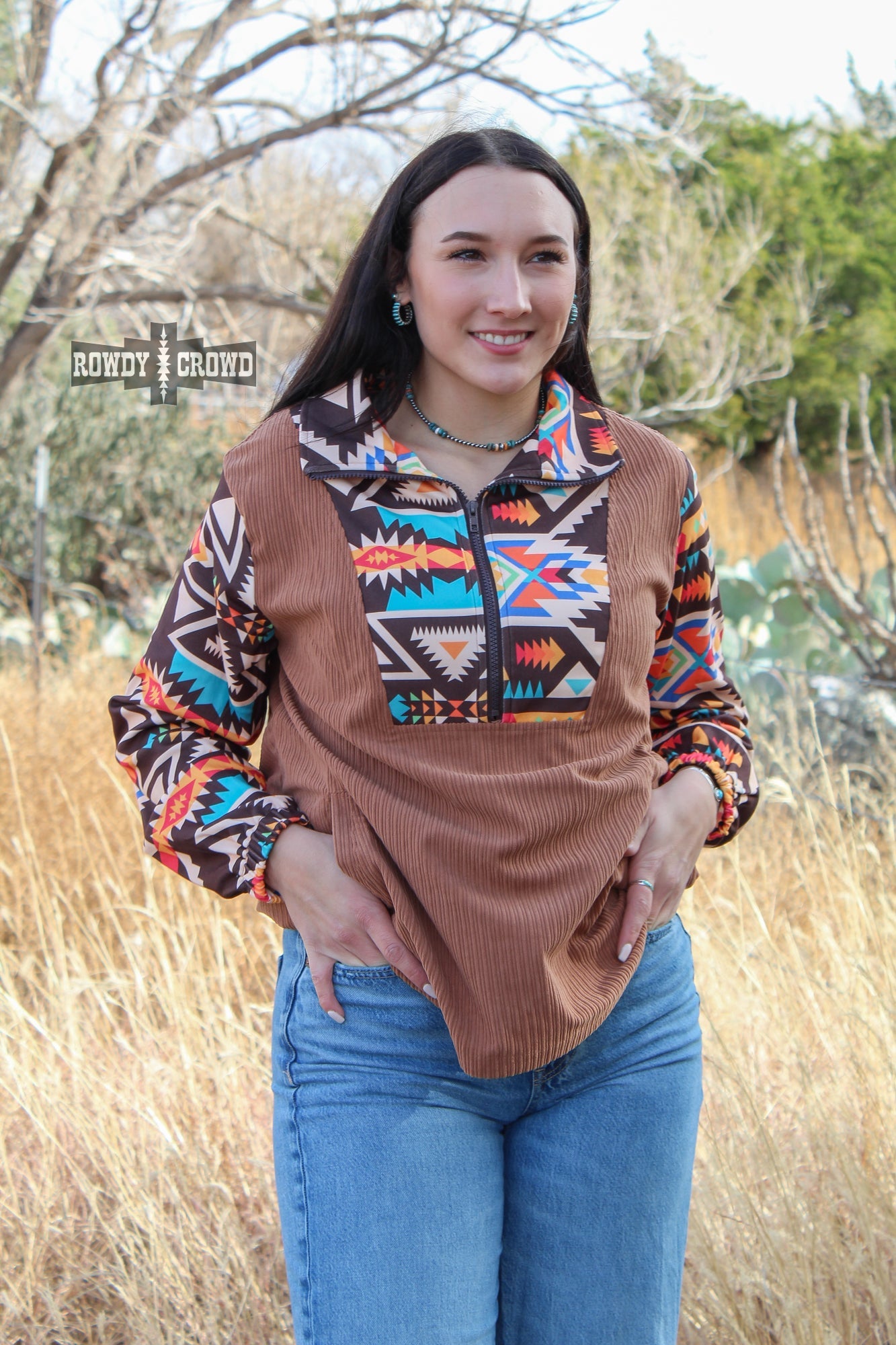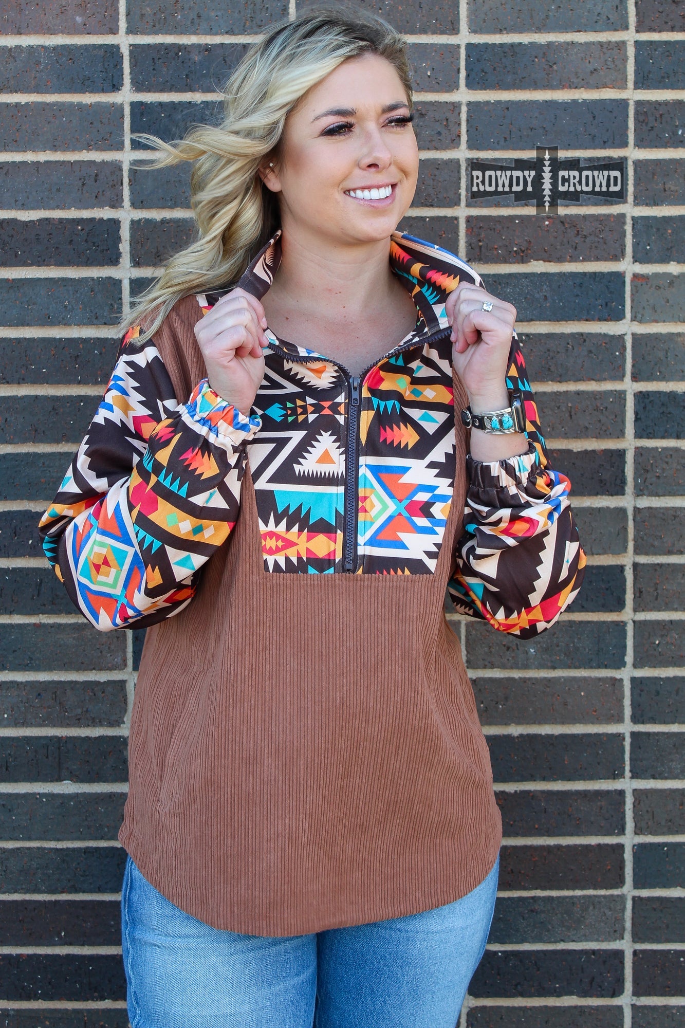 The Herdsman Half Zip Jacket, one of our most eye catching yet. With its beautiful bright aztec pattern on a ribbed brown base, it is everything we've dreamt of. This jacket has a comfortable, relaxed fit along with a half zip AND pockets. Sure to make your cooler days just a little brighter!
