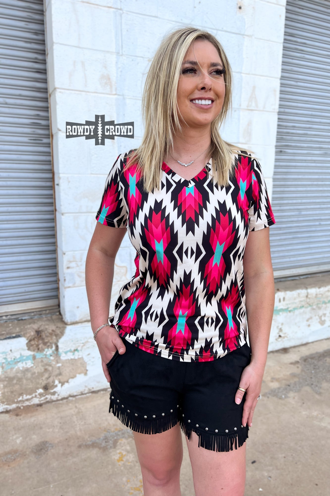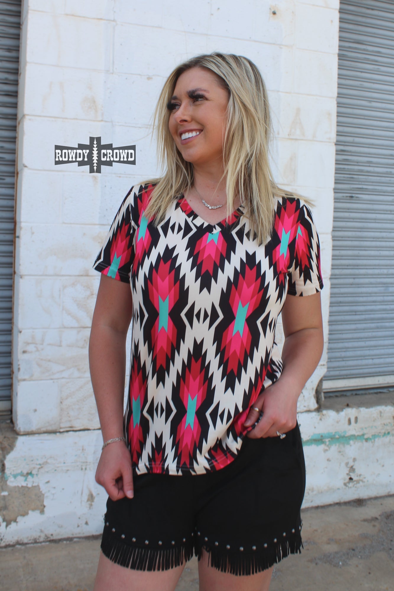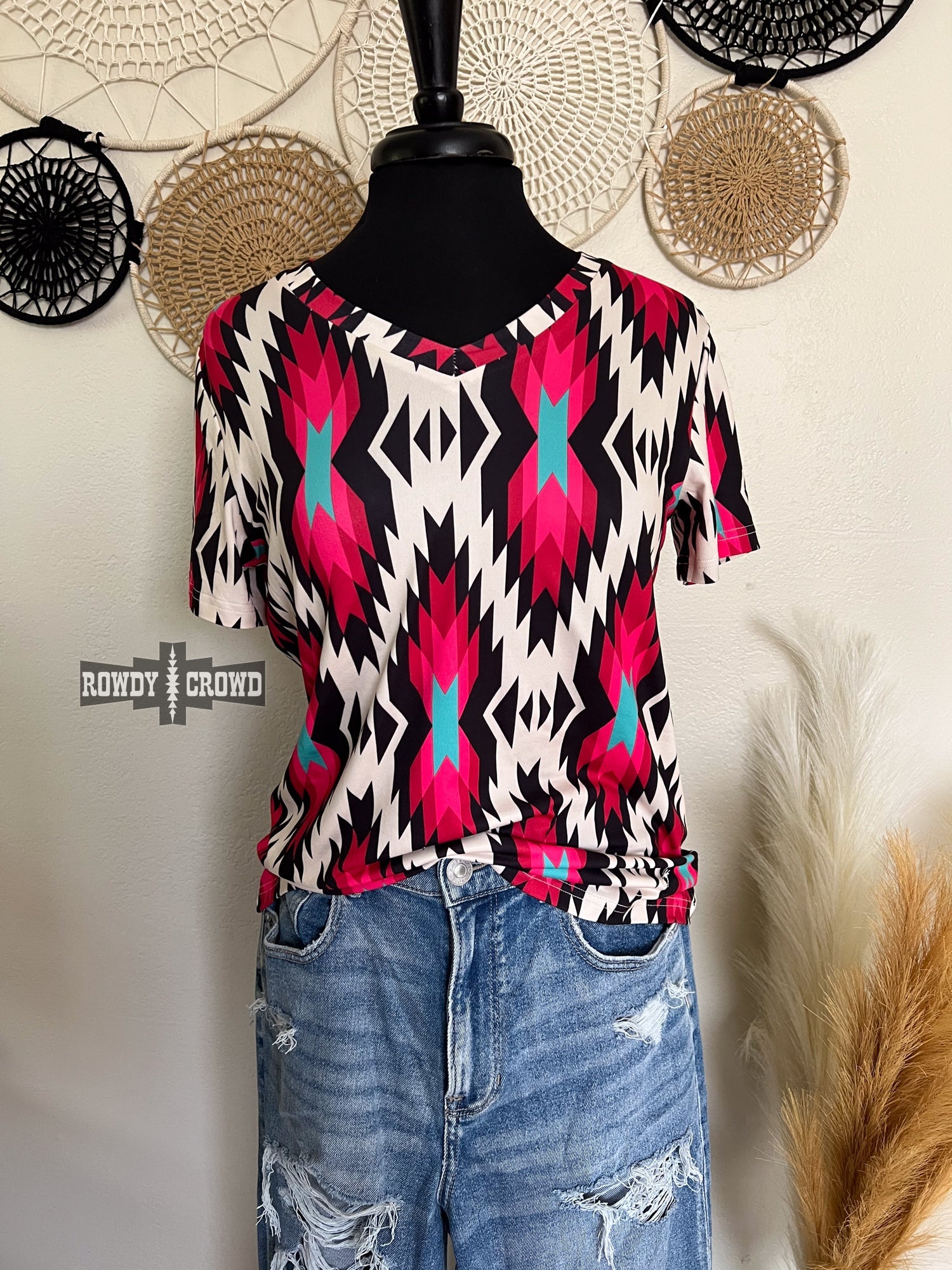 Get ready to turn heads with the Jesse James Top! Featuring eye-catching colors of pink, turquoise, black, and white in a vibrant Aztec print. The v-neck and fun design adds a touch of western, making it both fun and fashionable. This top is true to size and has a stretchy forgiving material that is soft as butter!