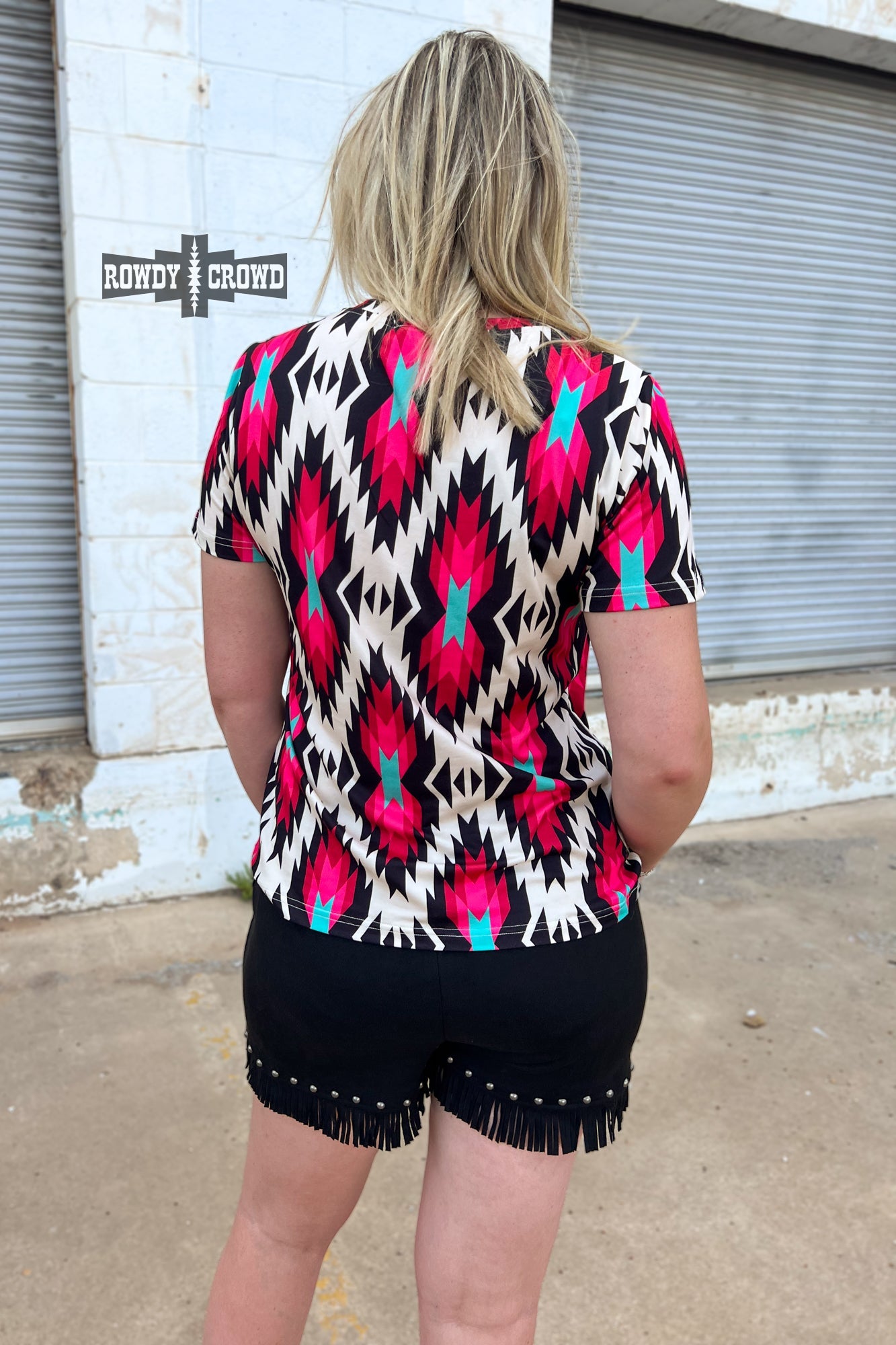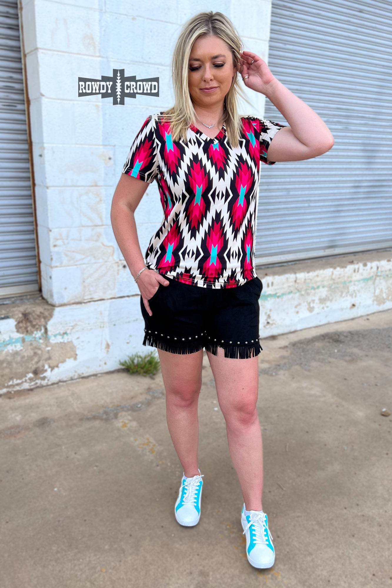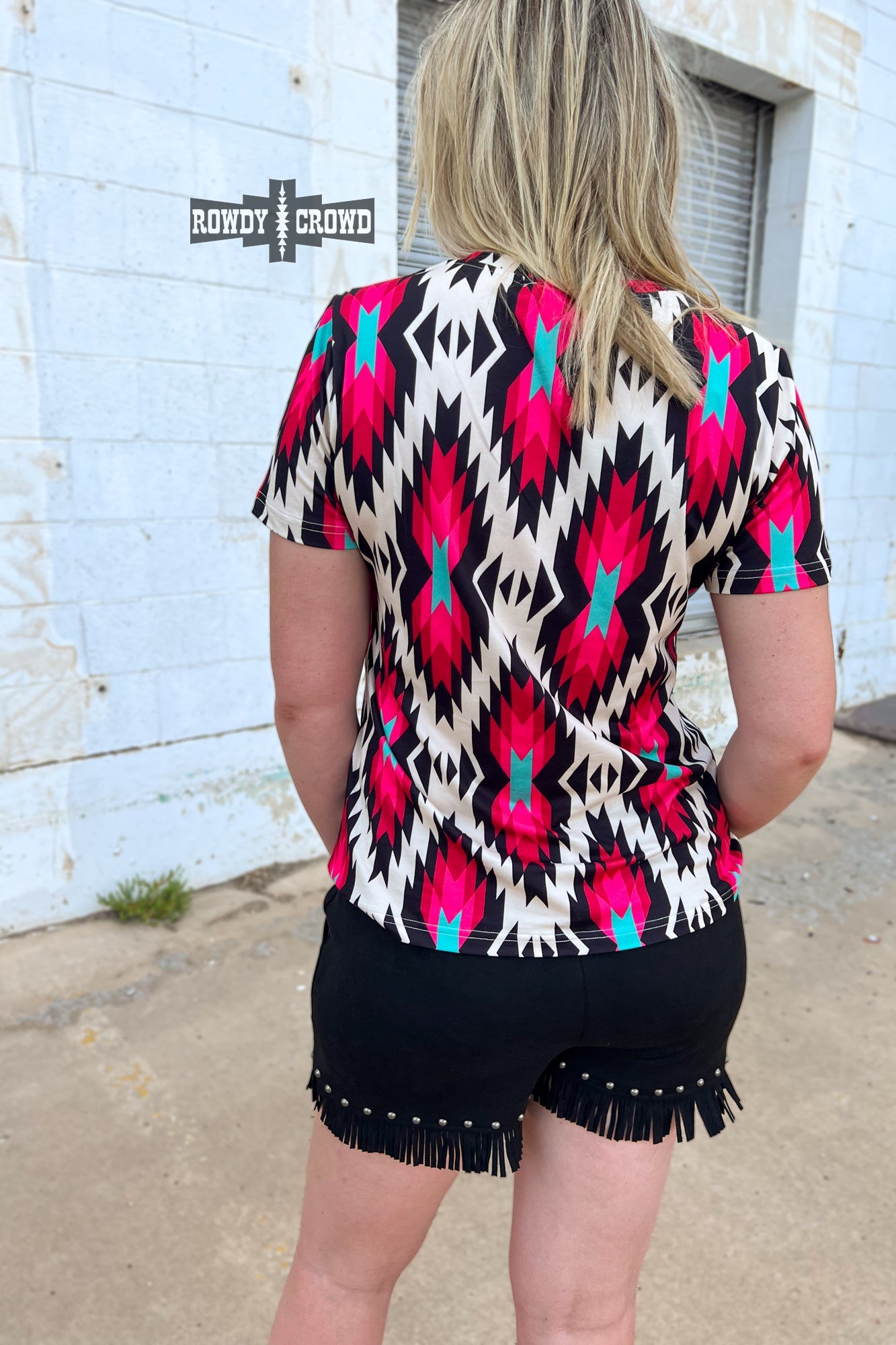Get ready to turn heads with the Jesse James Top! Featuring eye-catching colors of pink, turquoise, black, and white in a vibrant Aztec print. The v-neck and fun design adds a touch of western, making it both fun and fashionable. This top is true to size and has a stretchy forgiving material that is soft as butter!