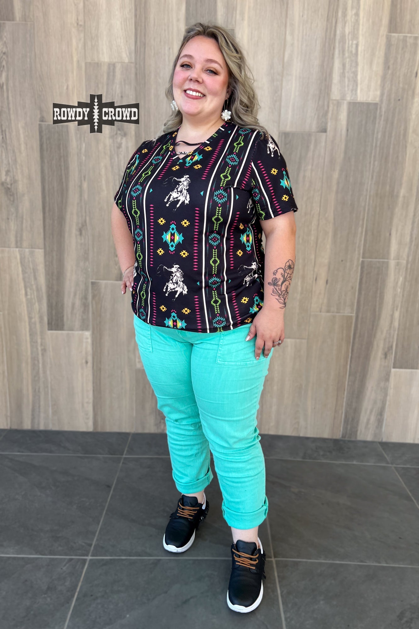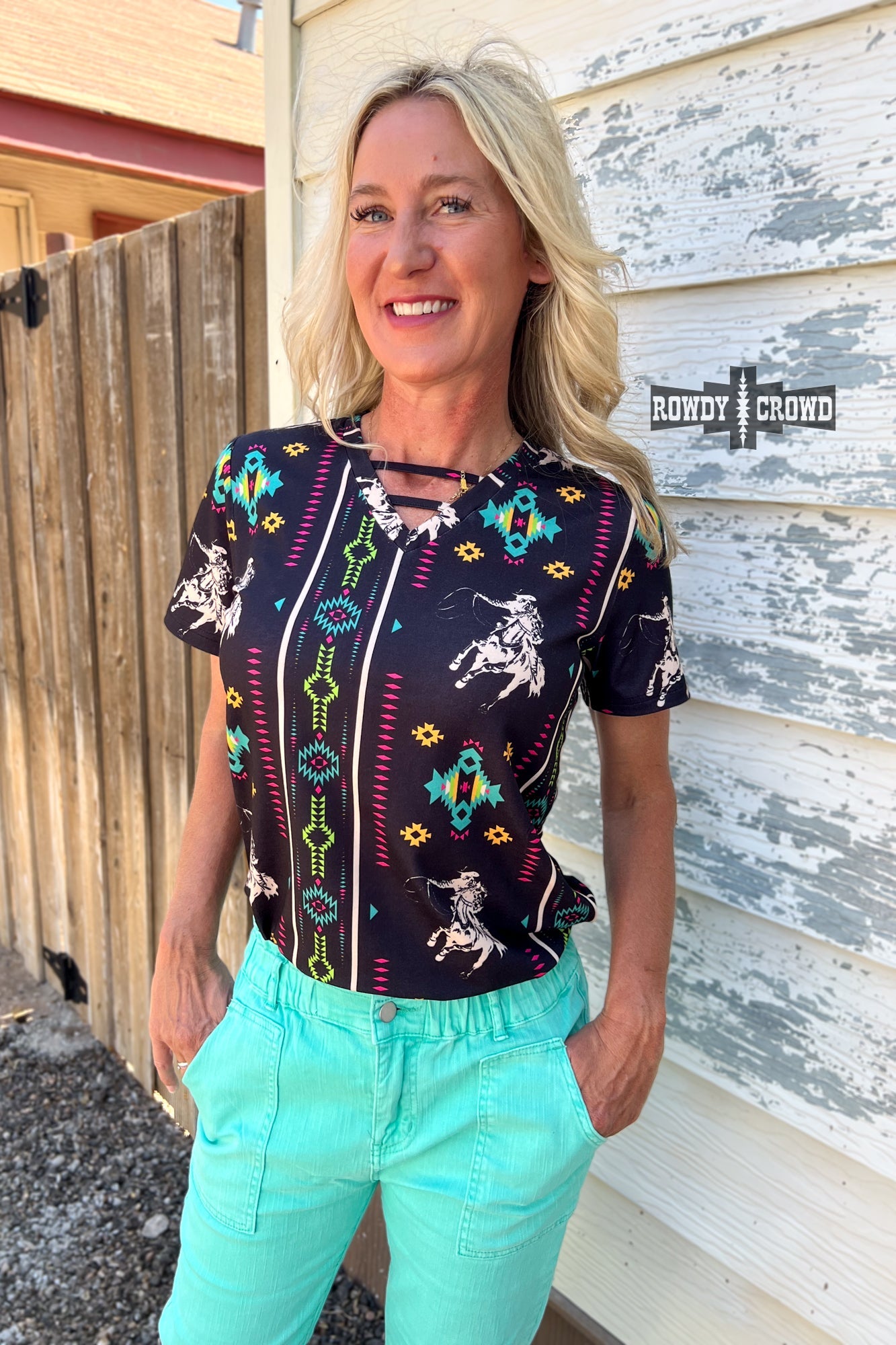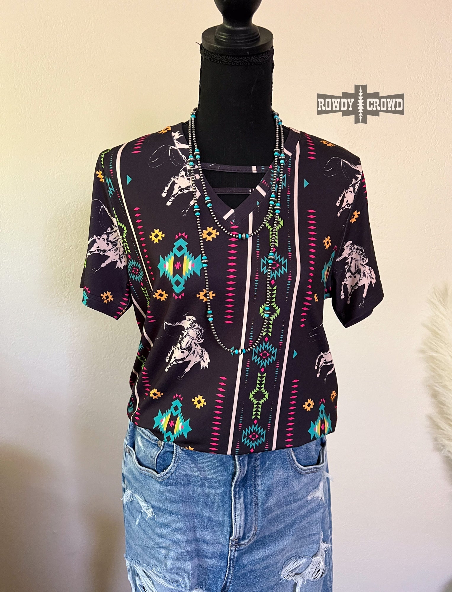 Let's RODEO in this fun and sleek top! Featuring a bold aztec print and a roper design, this top is sure to be your go-to. With criss-cross straps on the chest for added detail, this top is cute and ready to make a statement. Saddle up and get ready to turn heads!
