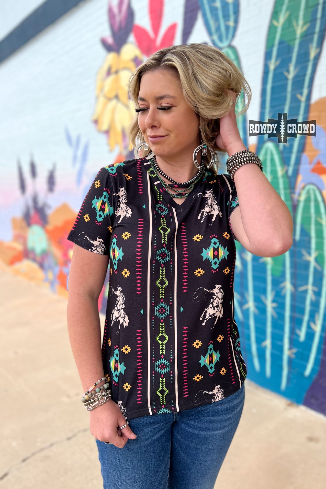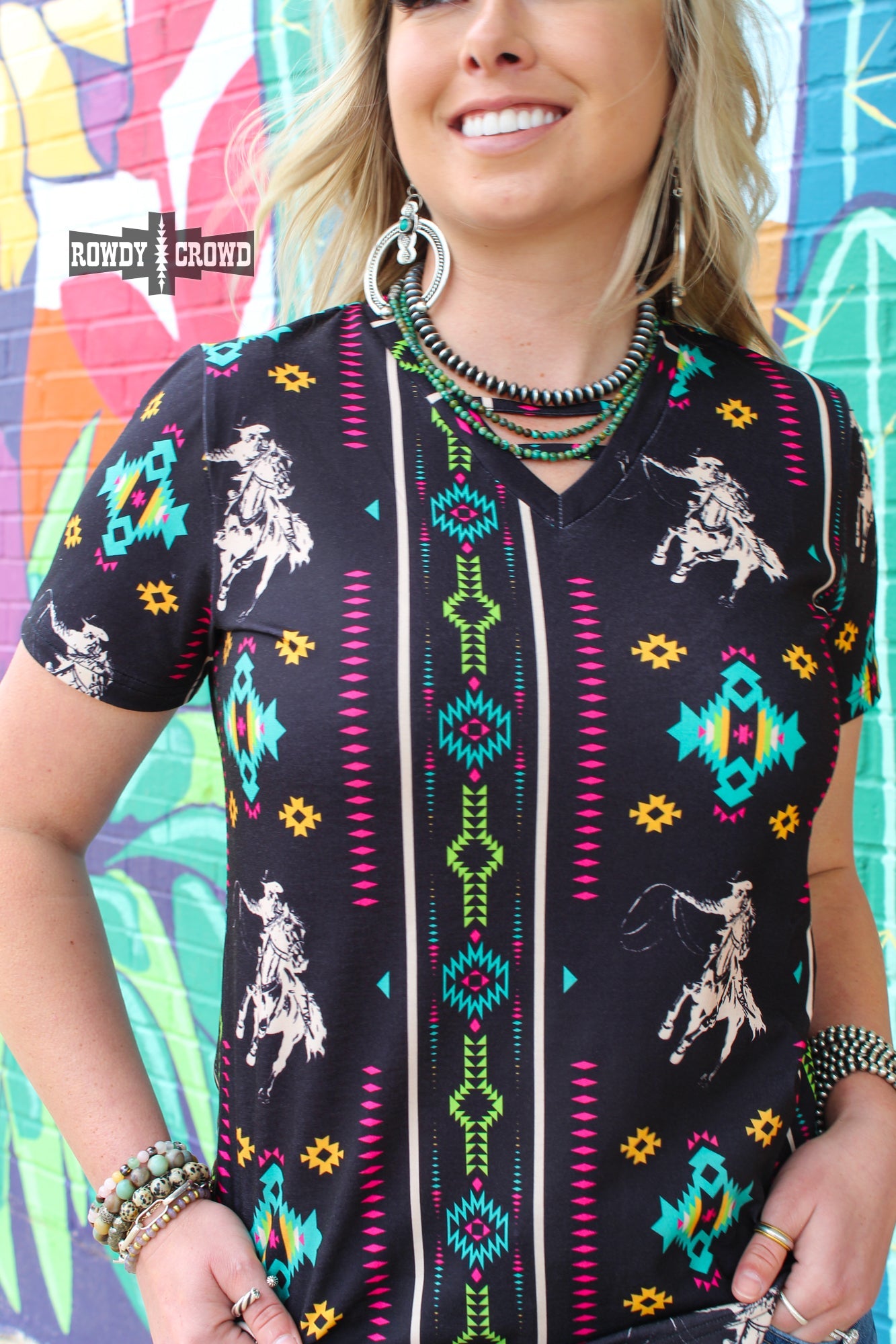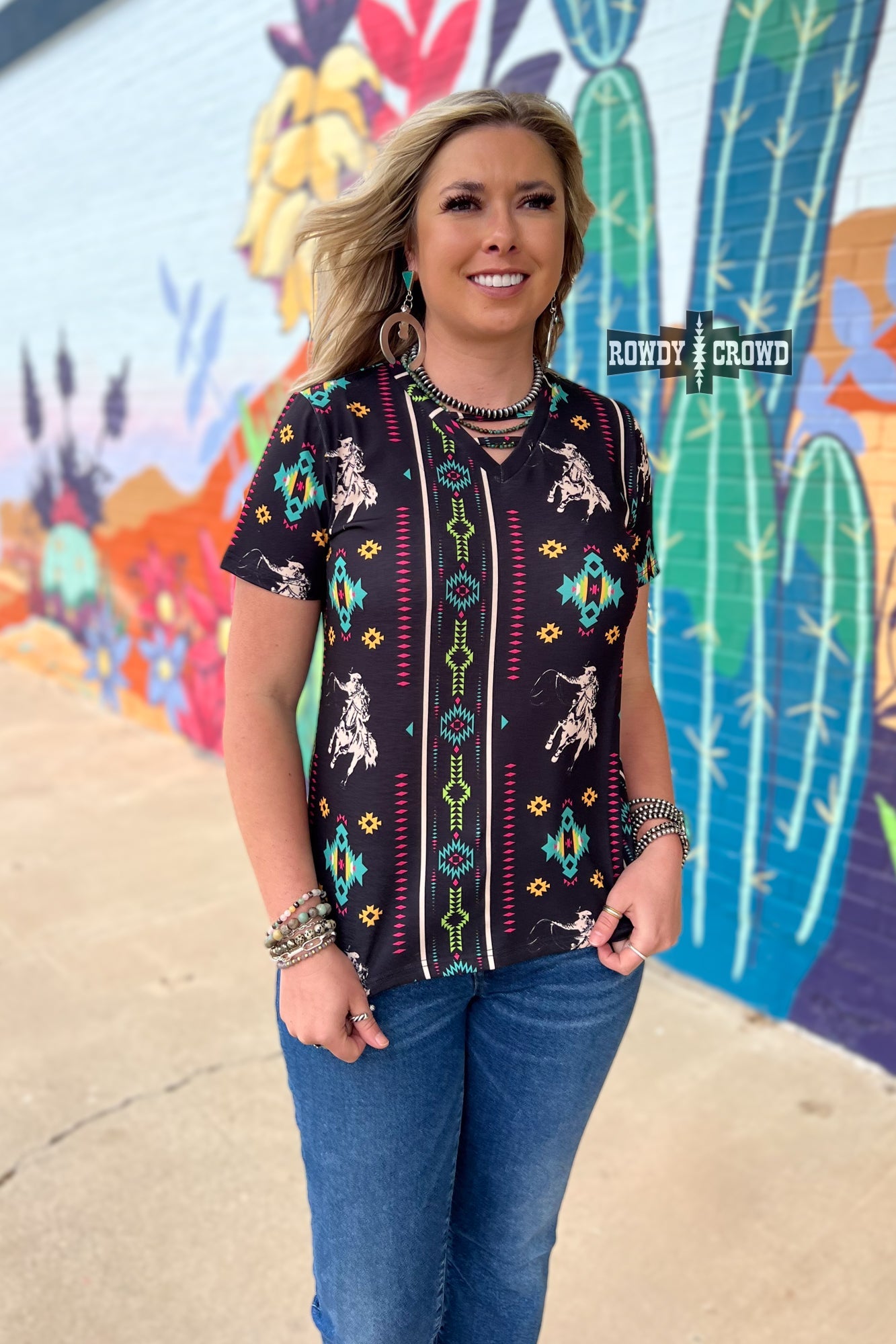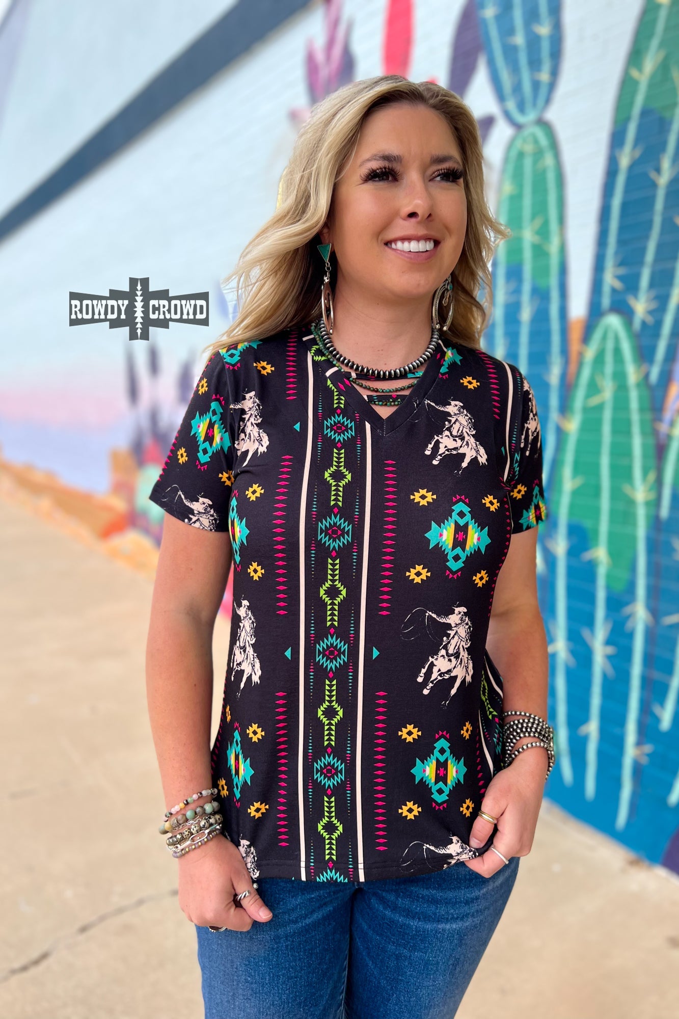 Let's RODEO in this fun and sleek top! Featuring a bold aztec print and a roper design, this top is sure to be your go-to. With criss-cross straps on the chest for added detail, this top is cute and ready to make a statement. Saddle up and get ready to turn heads!