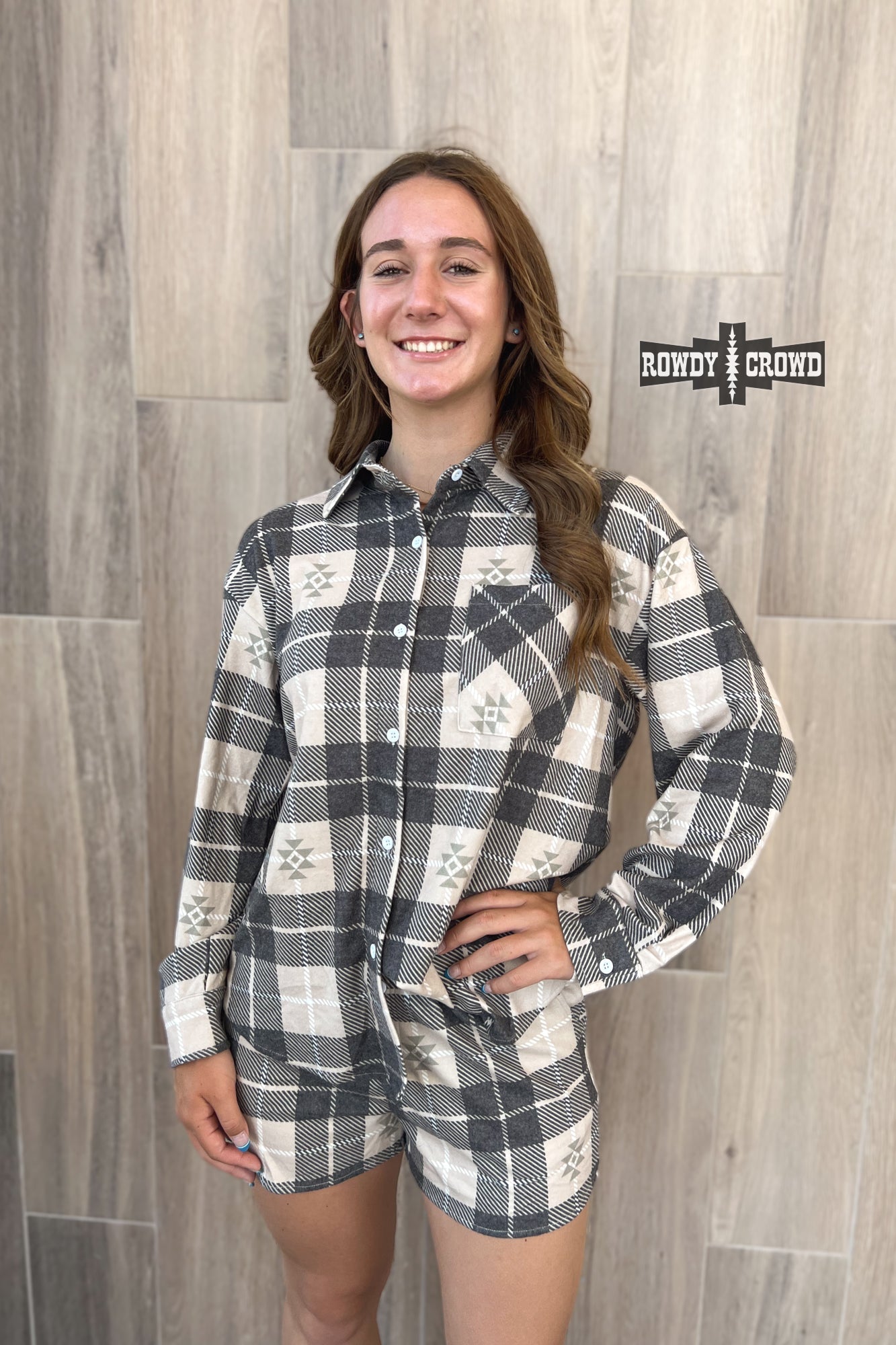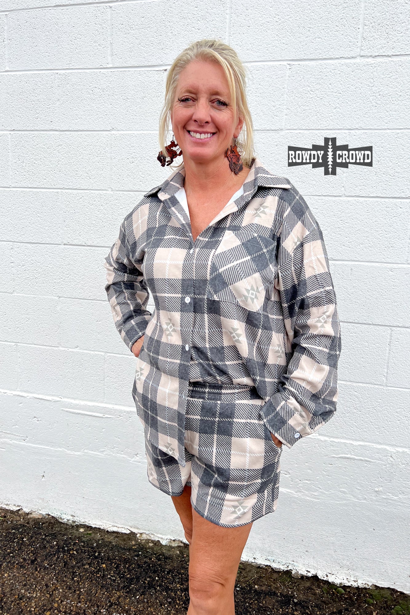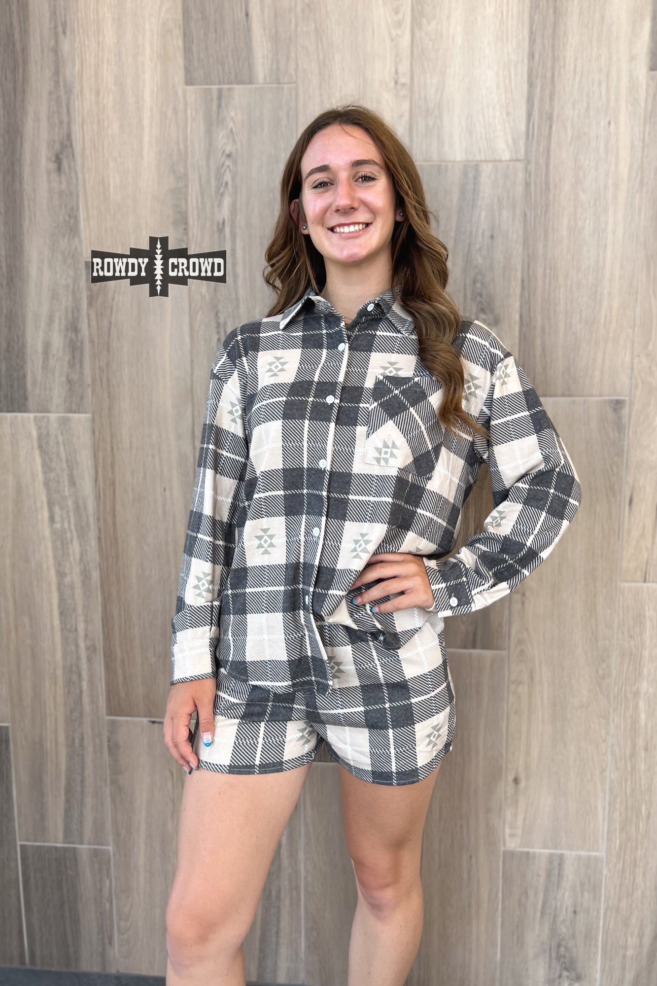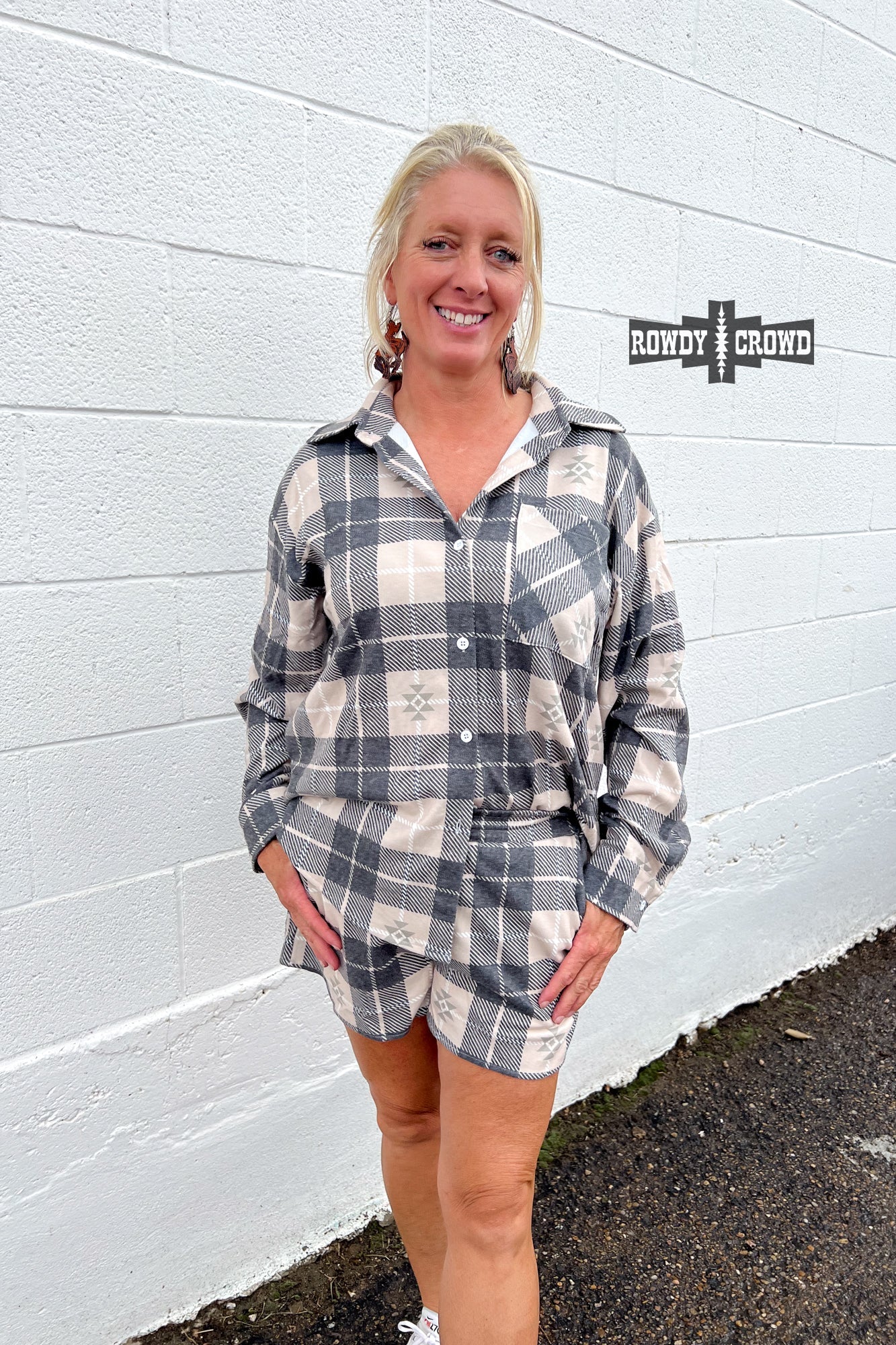 The Luckenbach Lounge Set is the perfect lounge set for keeping cozy this season. Its VERY SOFT fabric with gorgeous plaid print with the iconic Rowdy Crowd Aztecs makes it a must-have for any Western gal. The elastic waistband in the bottoms ensures a comfortable fit for all. You'll want to snag this set while you can as this is sure to be a crowd favorite.