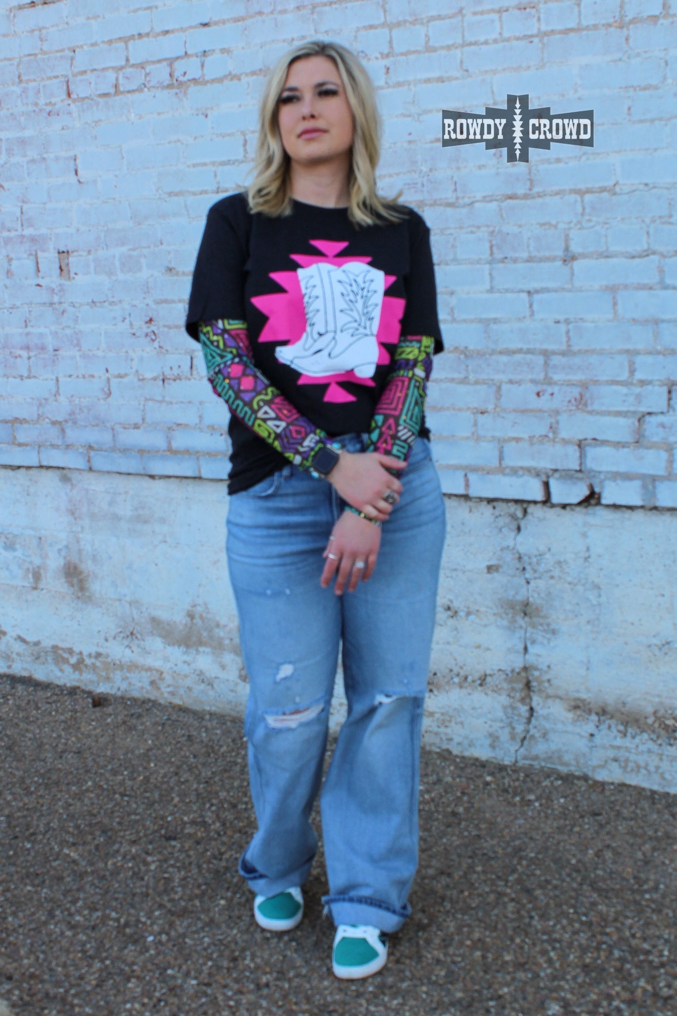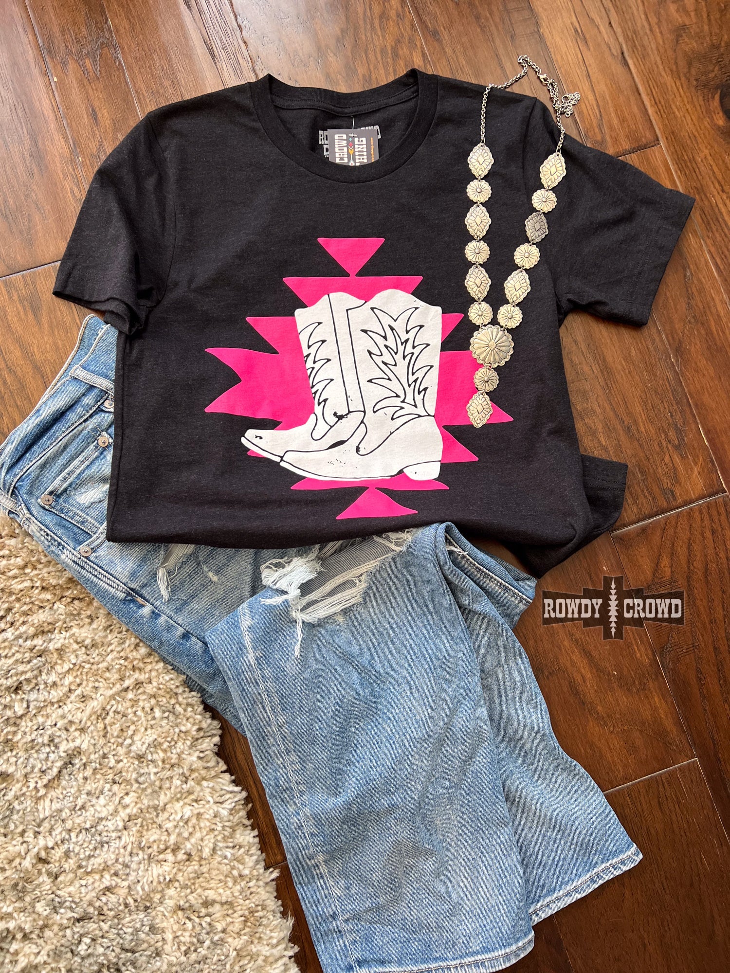 western, western tee, graphic tee, western graphic tee, rowdy crowd clothing, western, rowdy crowd clothing, black graphic tee, aztec graphic tee, pink aztec, boot graphic tee, made for walkin'