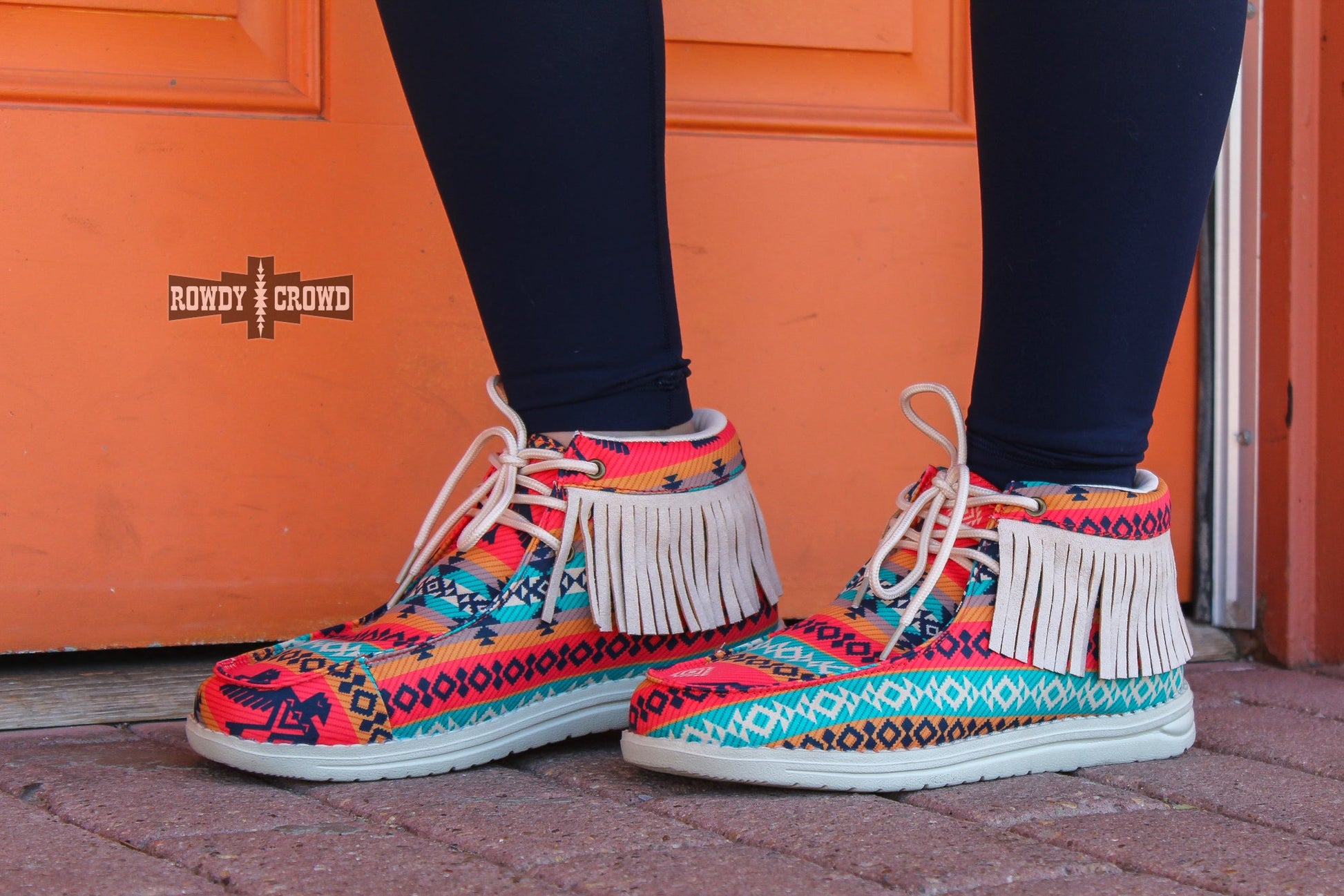 Do you love a statement shoe? Well, the western Maverick Mid Rise Shoes are the ones for you! With the bold phoenix aztec pattern and white fringe these are sure to catch some eyes. The perfect mix of comfy and stylish, show off your rowdy side with the Maverick Mid Rises.