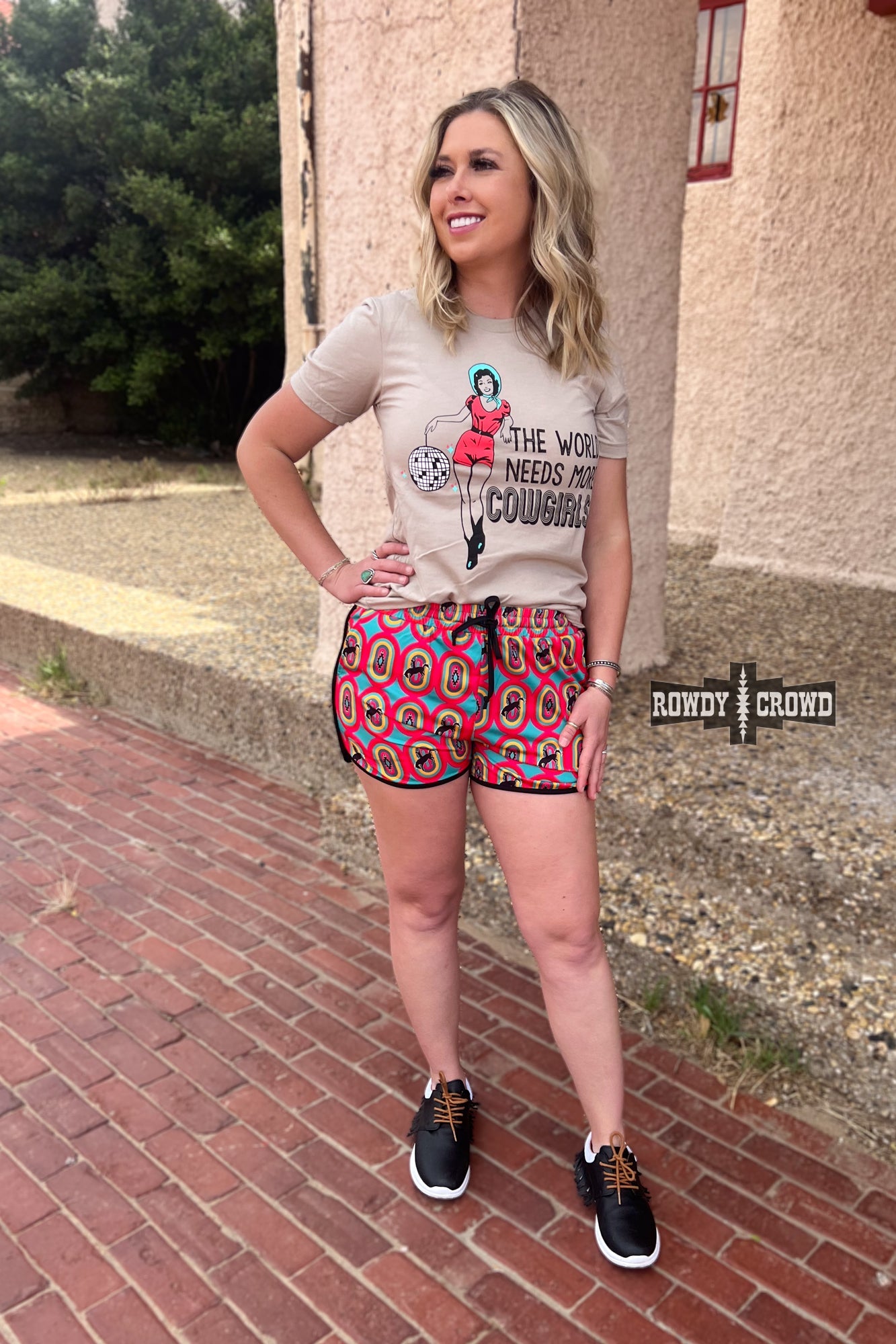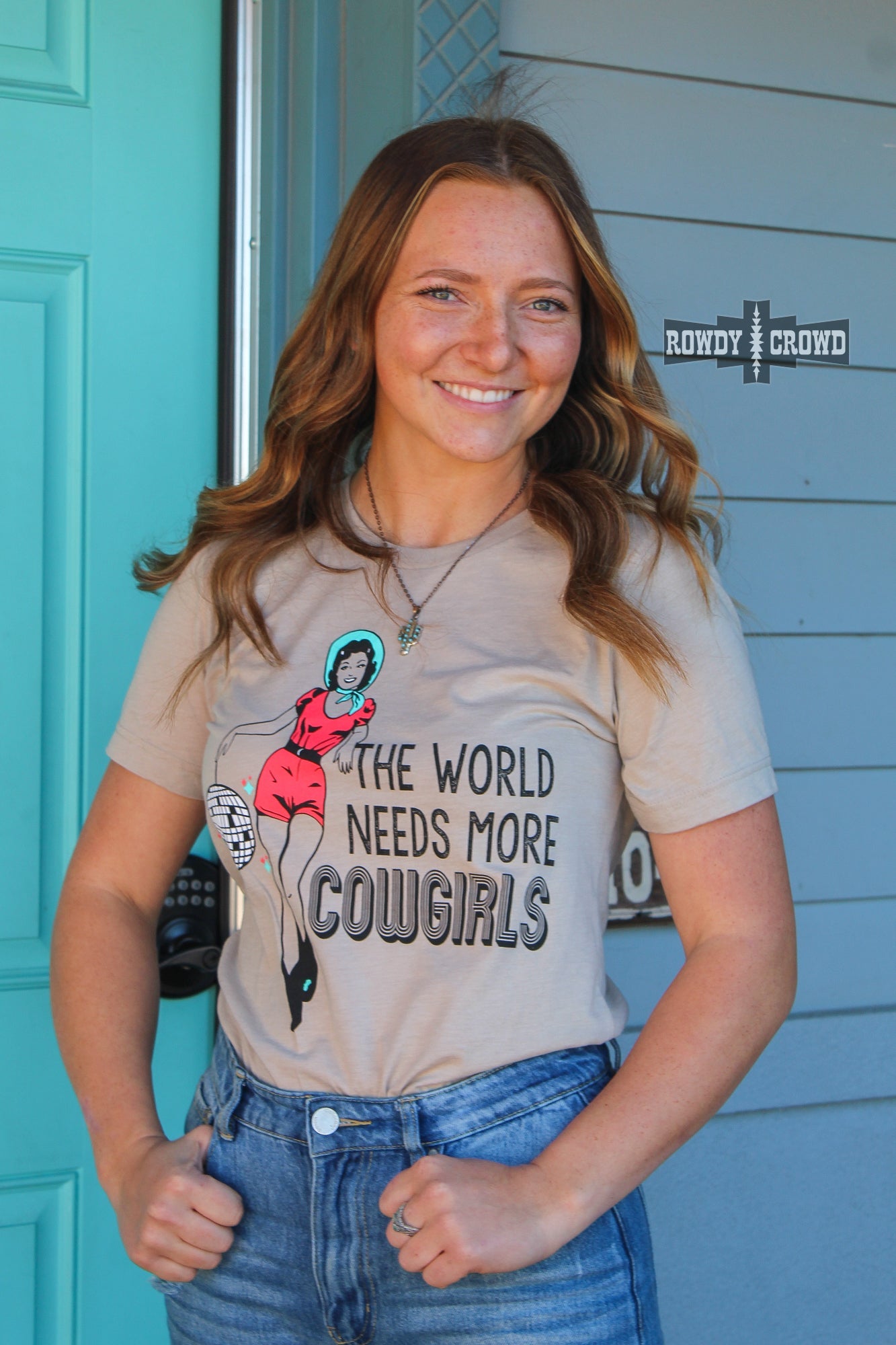 This tee is the perfect way to show your style and sense of fun. Featuring a retro cowgirl in a unique pinky red outfit and blue hat, this tan shirt makes a statement that celebrates a spirit of adventure. With the phrase "the world needs more cowgirls," this tee is sure to grab attention!