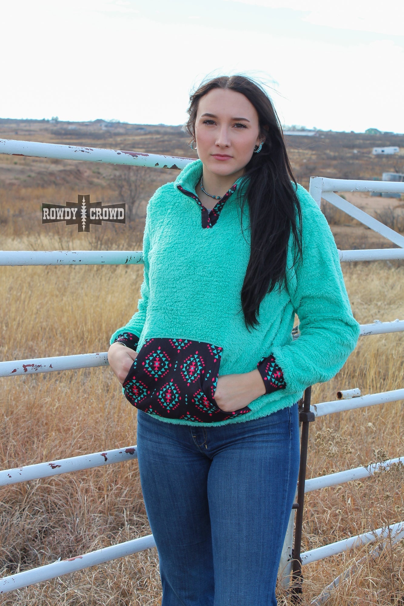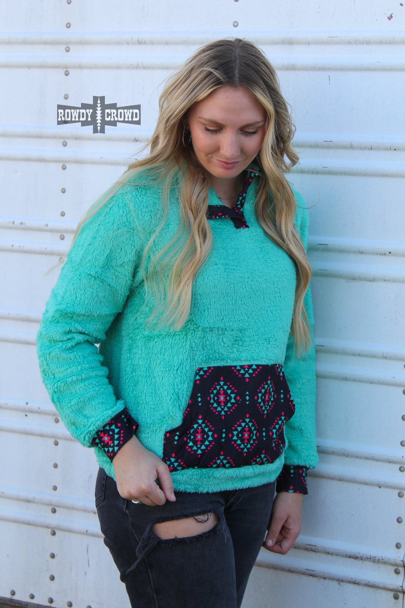 western wholesale, western fashion, western apparel, pullover, turquoise pullover, Aztec pullover, Aztec pocket, women's fashion, winter fashion, soft pullover, pullover with pocket, warm pullover, rowdy crowd clothing, black pocket, turquoise and black pullover, pink and turquoise Aztec, winter apparel, women's winter clothing