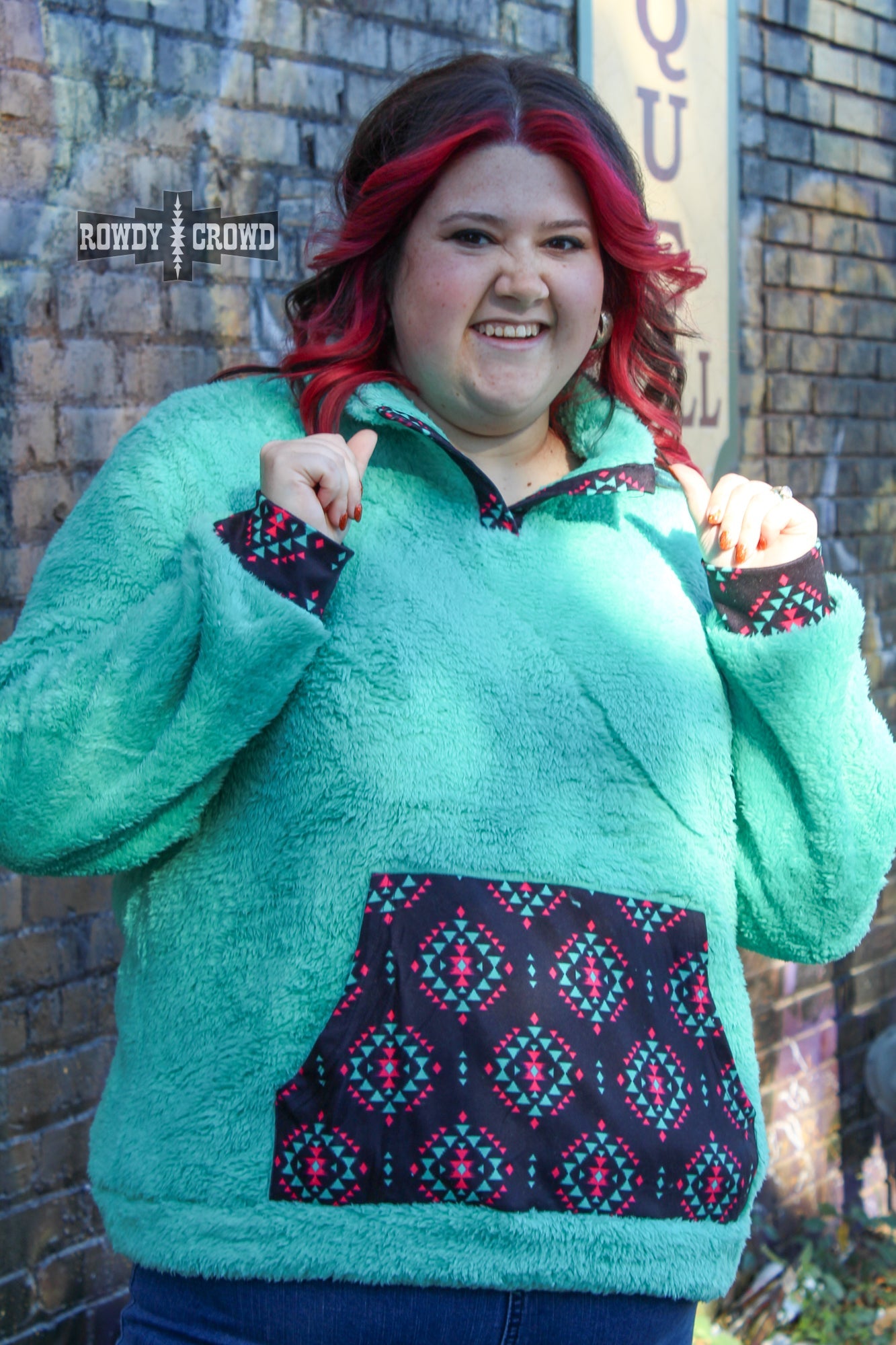 Do you love Sherpa pullovers? Well, meet your new favorite! The Pagosa Springs Pullover is soft and comfortable, along with having gorgeous colors! The turquoise sherpa fabric makes the beautiful Aztec print stand out along the collar, sleeve cuffs, and on the large front pocket!