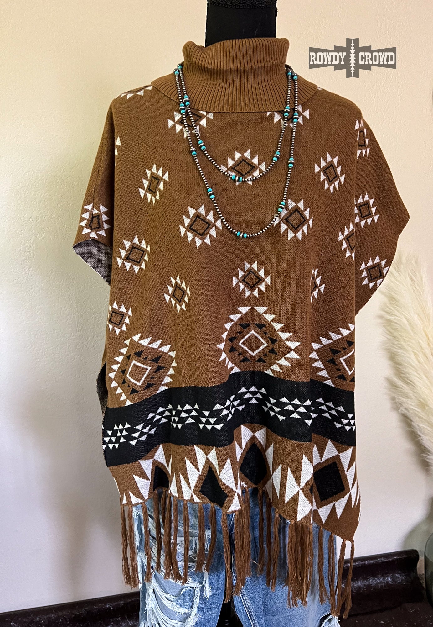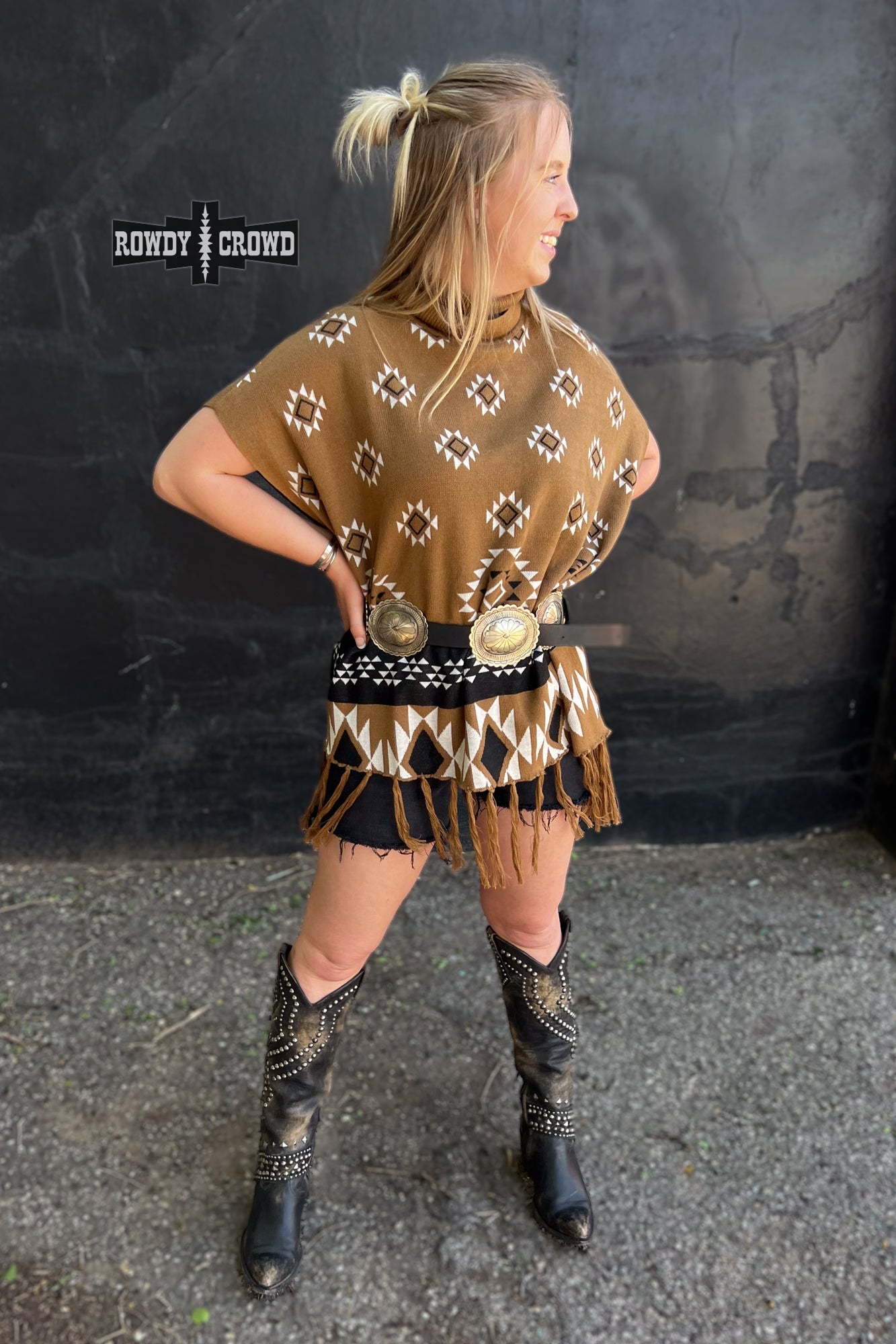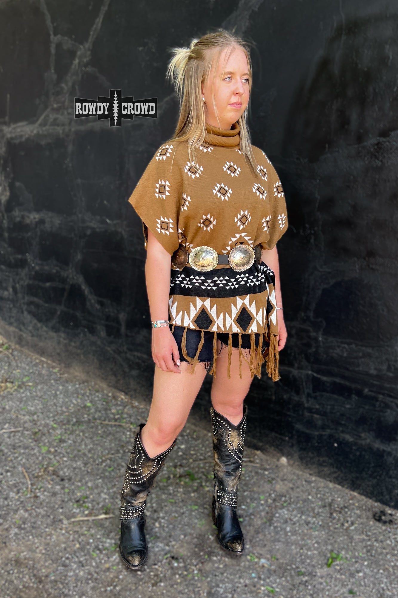 This weather calls for a good statement piece, and the Pistol Annie Poncho is it! This poncho has it all with its Aztec print and fringe. It is sure to turn heads and add to your outfit with comfort and style.