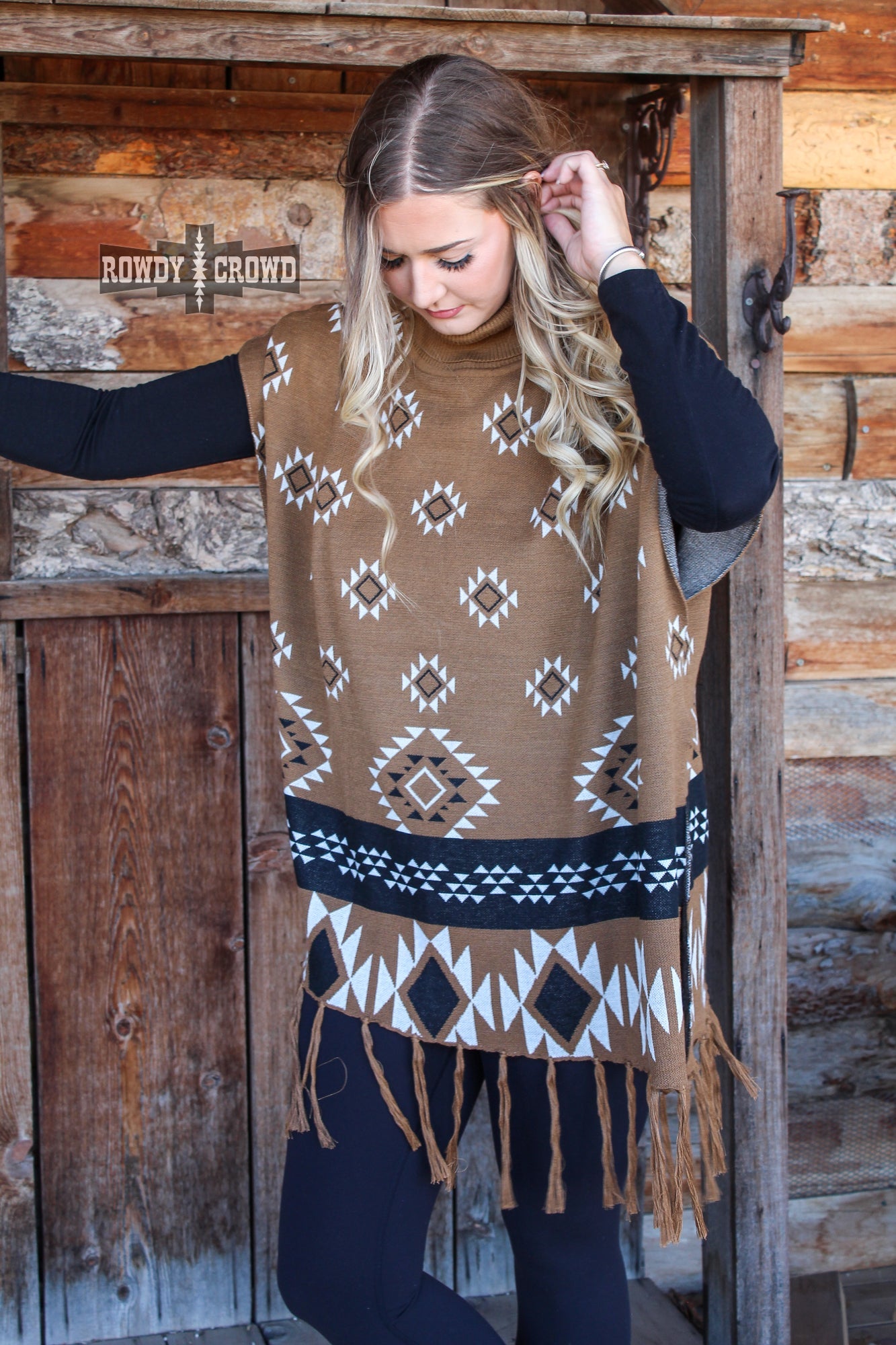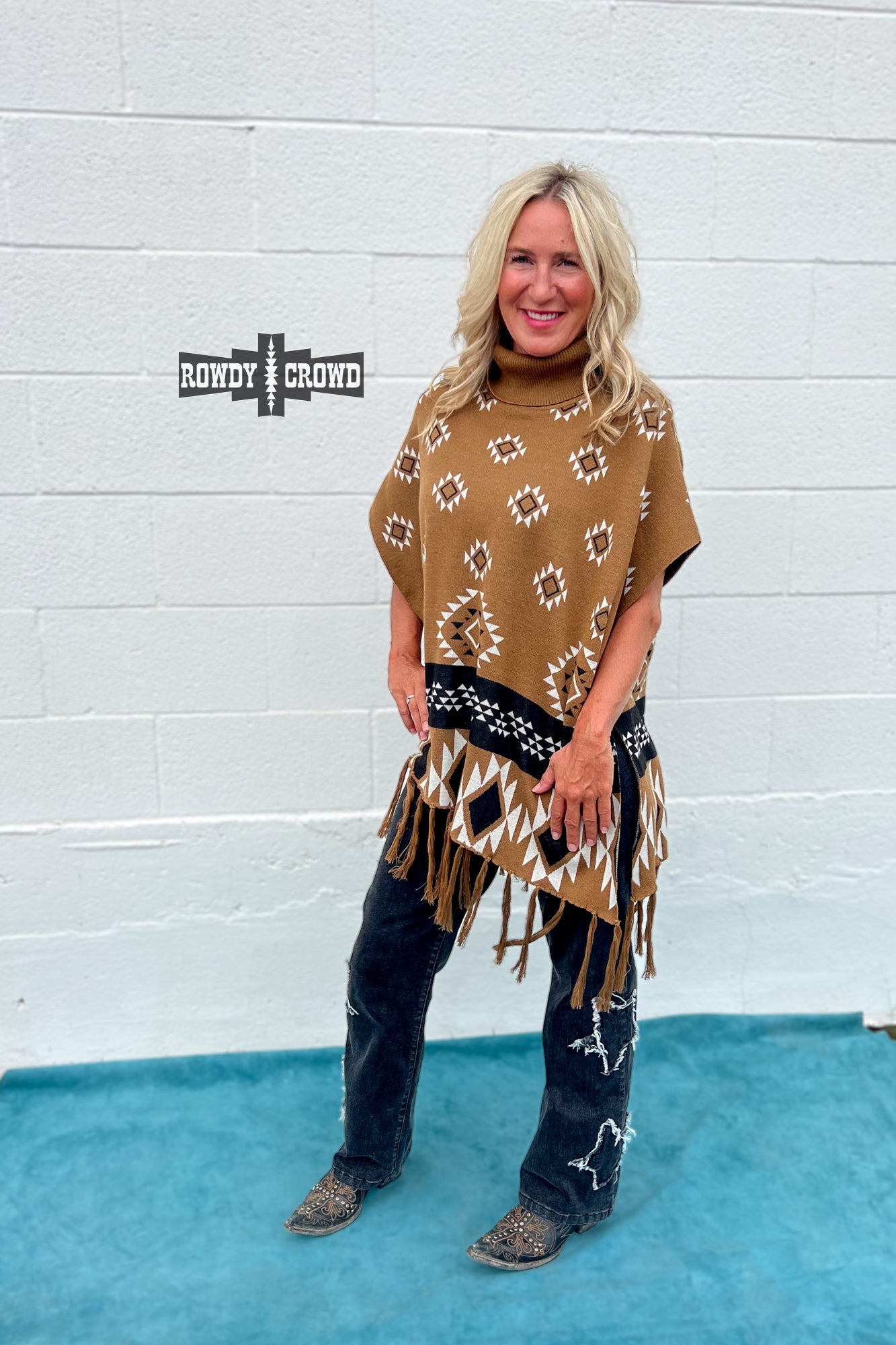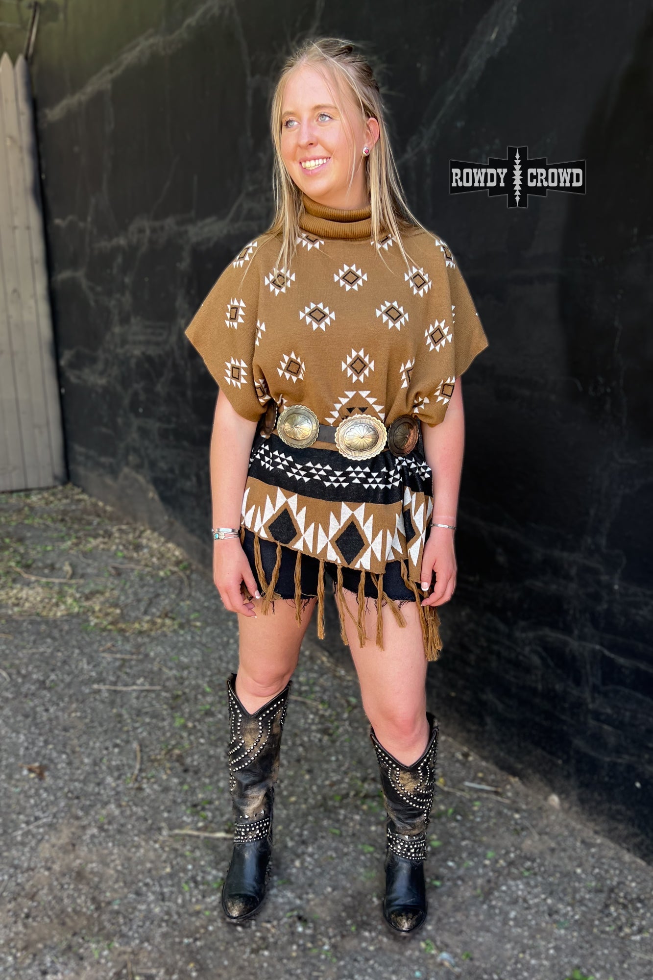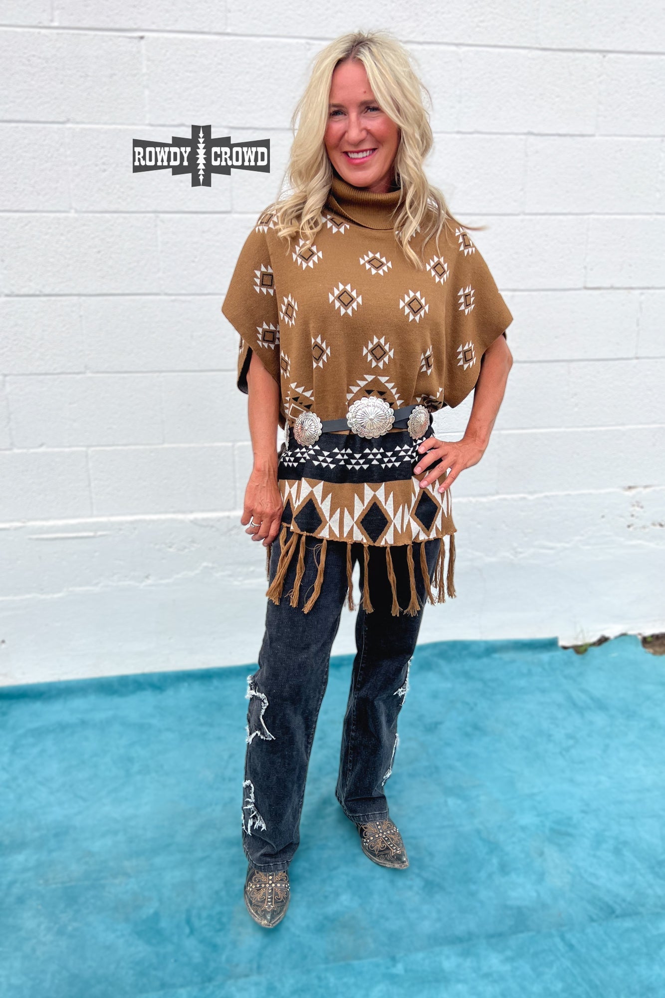 This weather calls for a good statement piece, and the Pistol Annie Poncho is it! This poncho has it all with its Aztec print and fringe. It is sure to turn heads and add to your outfit with comfort and style.