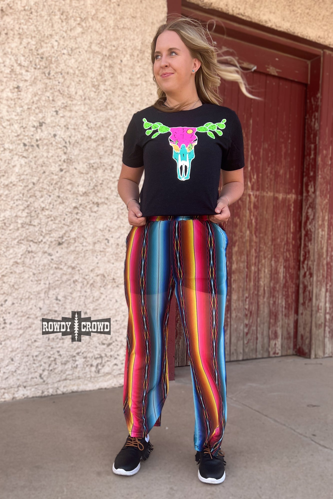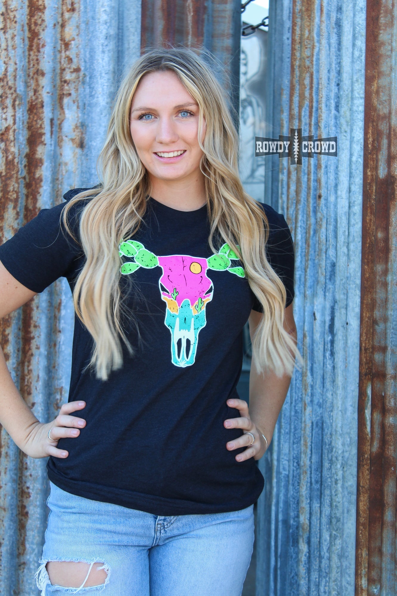 This Prickly Skull Tee will take you on a wild ride! Featuring a soft black tee with a cow skull with cactus horns and a vivid desert landscape in pink, teal, orange, and green, it will make you feel wild and adventurous. Dare to stand out in this unique piece!