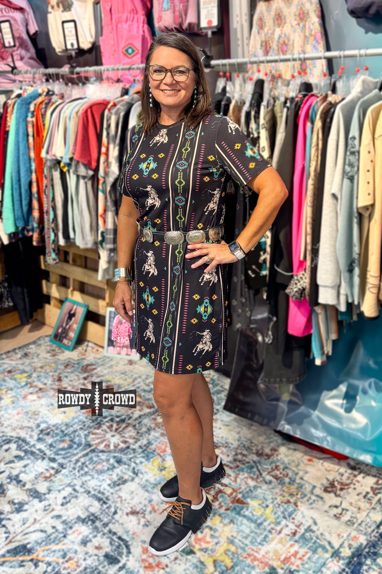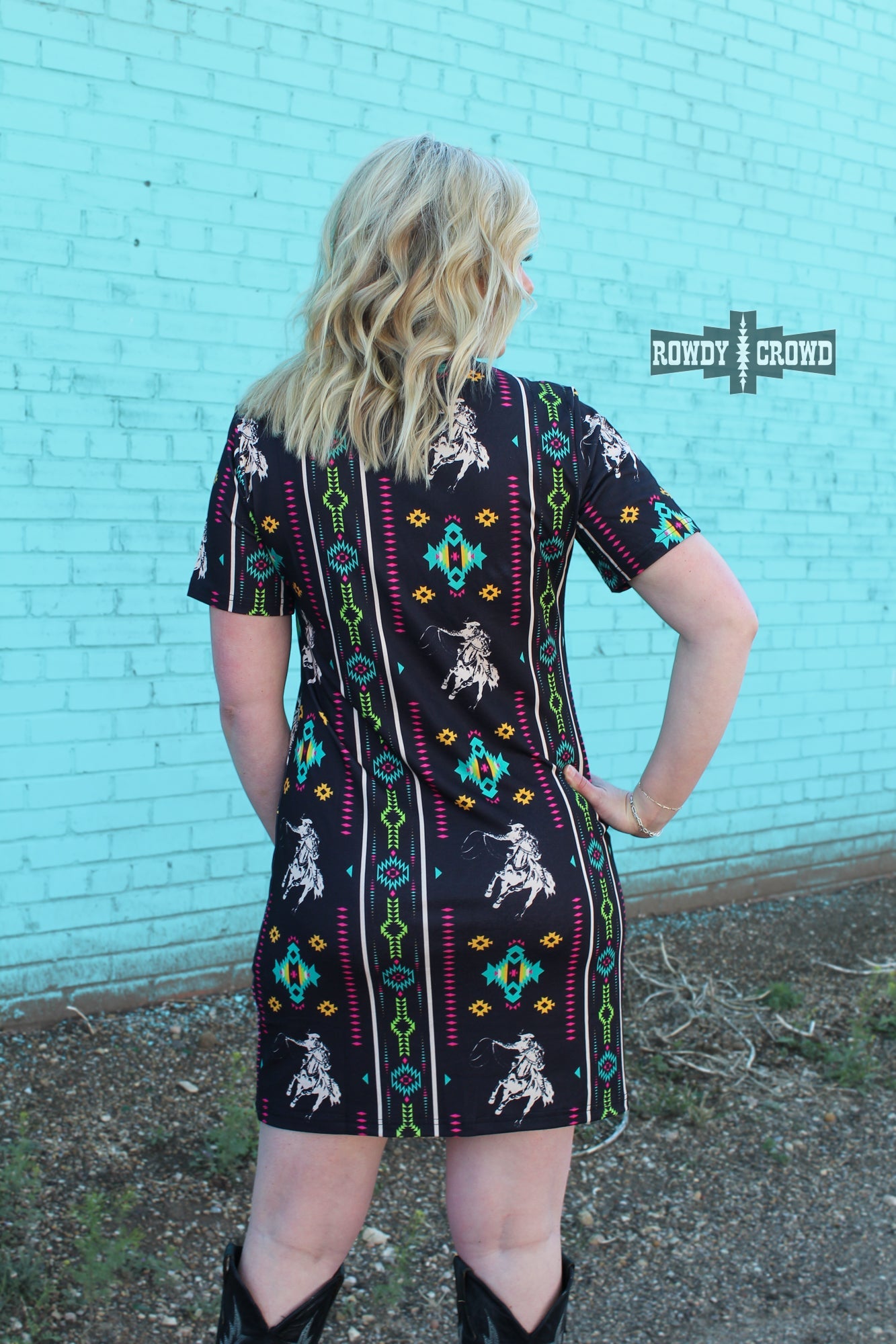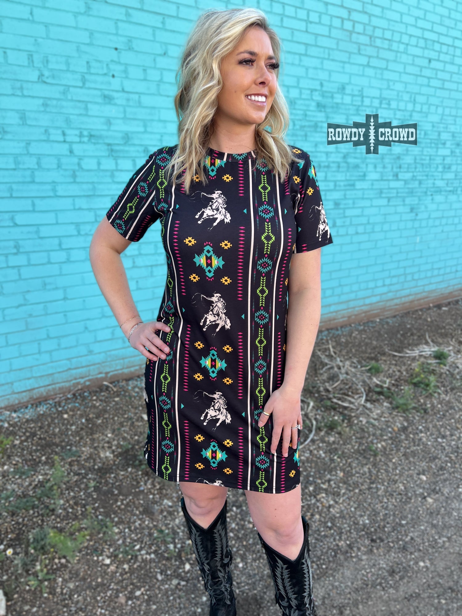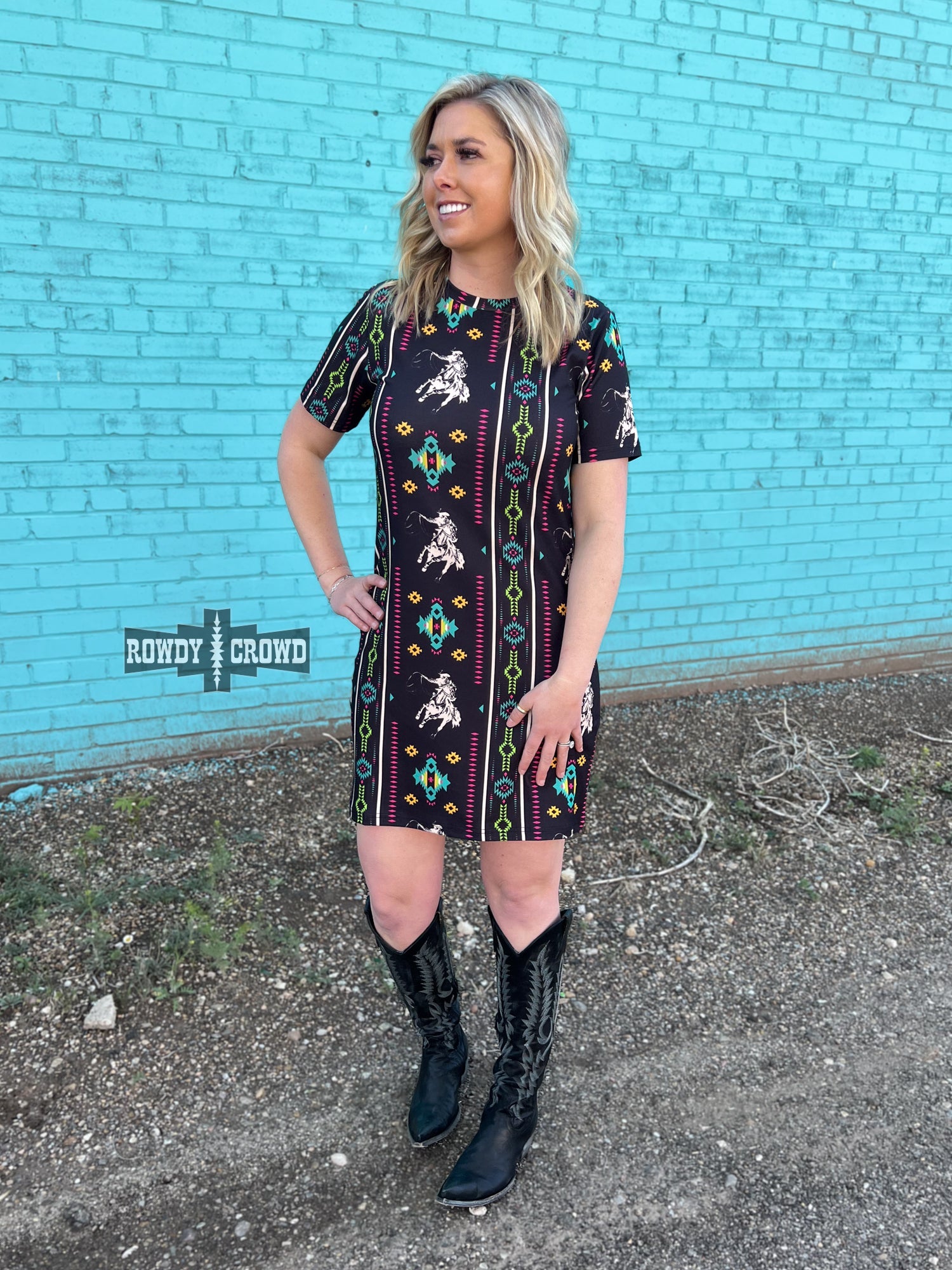 Elevate your style with our Rope & Ride Dress! The sleek and silky fabric will make you feel confident and comfortable. The perfect length and unique aztec and bronc rider print make it suitable for any occasion. Upgrade your wardrobe today!