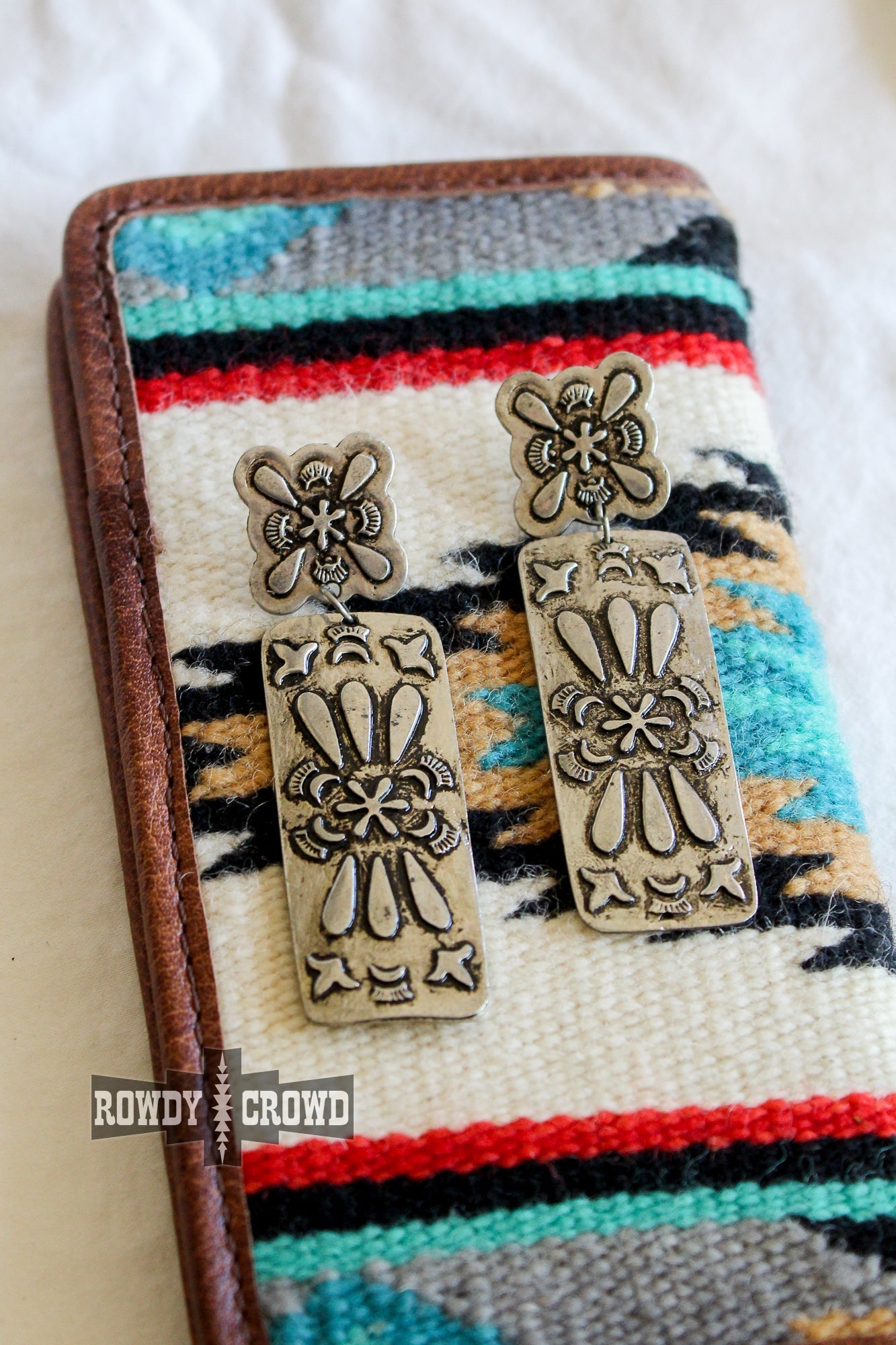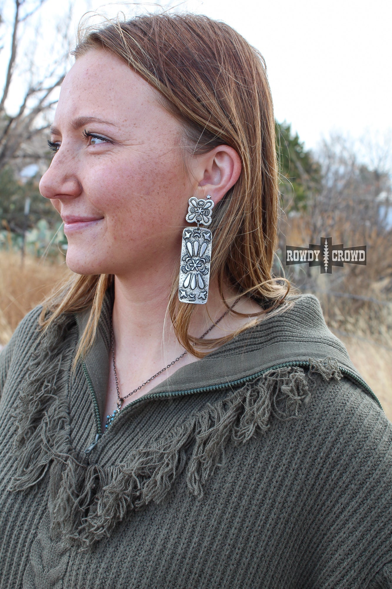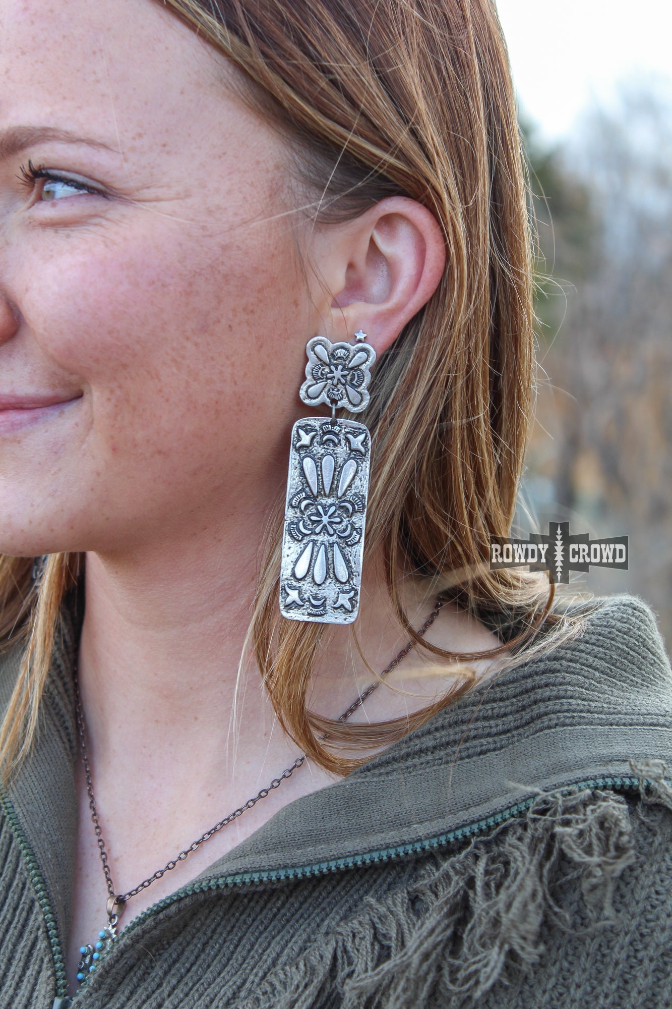 Silver scalloped studs adorned with intricate engraved designs and a silver rectangle drop, the Silver Dollar Earrings will sparkle and shine with every movement.