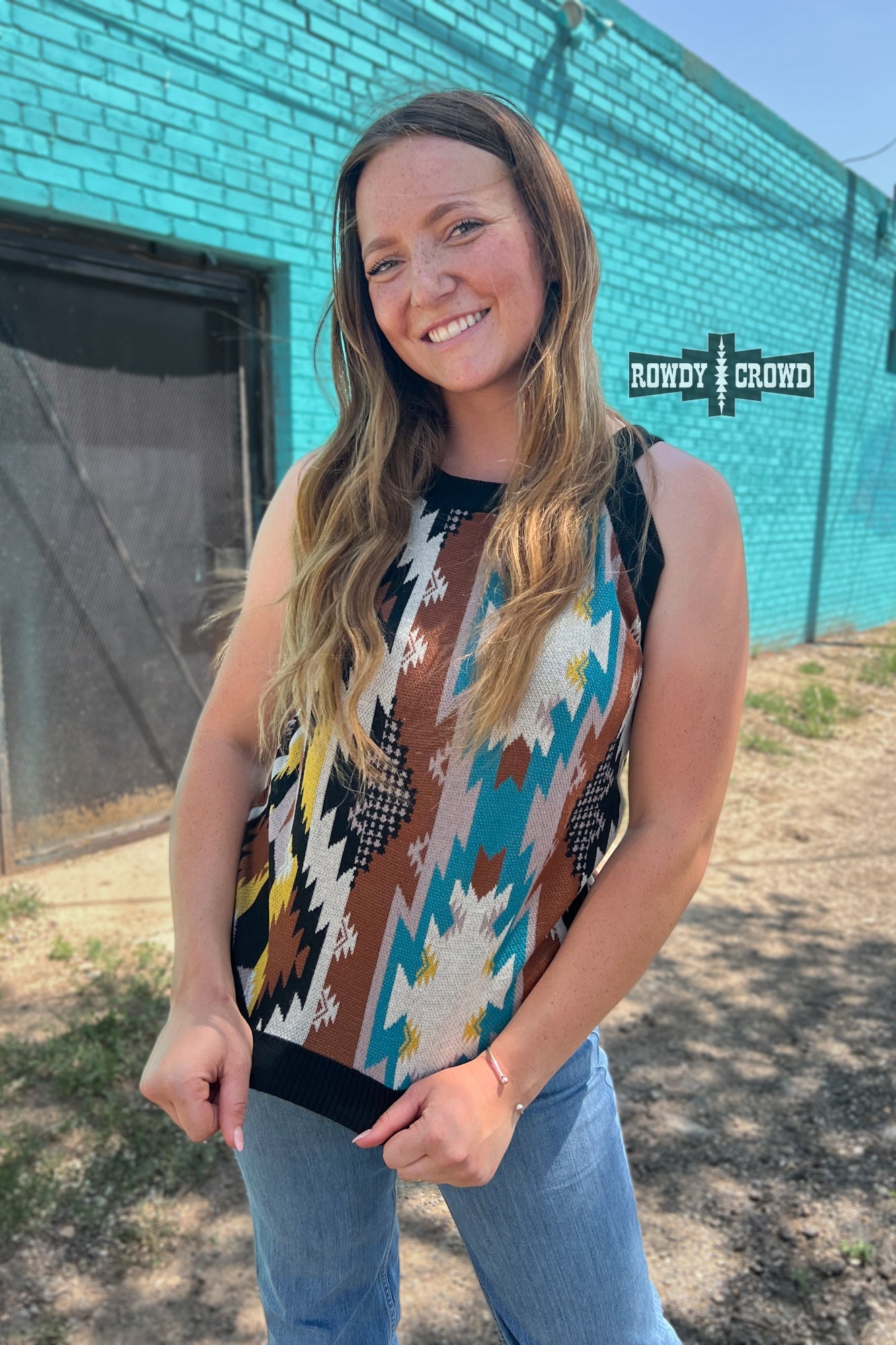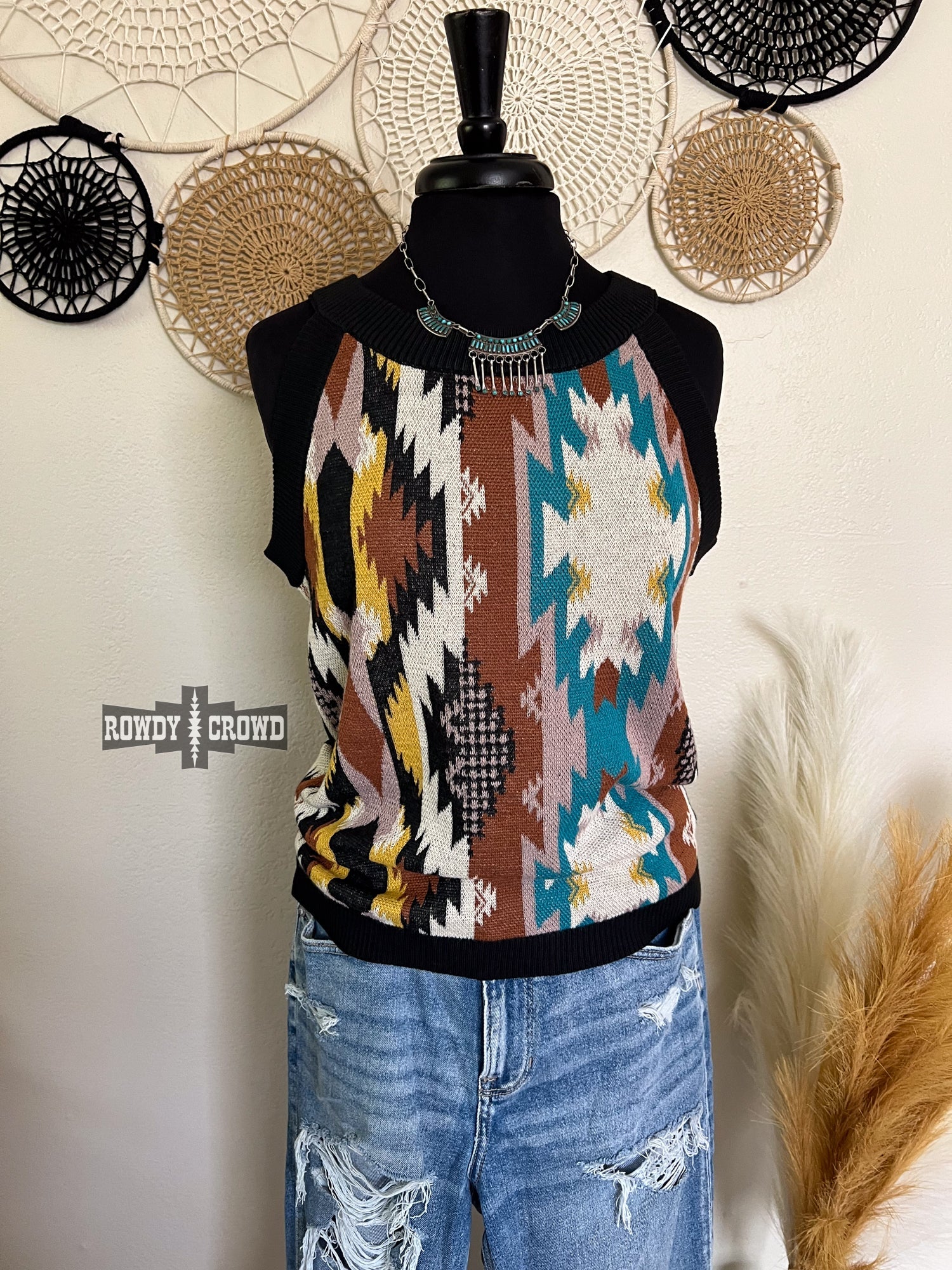 Stand out and stay rowdy in the Stagecoach Sweater Tank. Its soft knit and beautiful Aztec print will have you reaching for it every time. Its comfortable fit and cut make it perfect for any occasion.