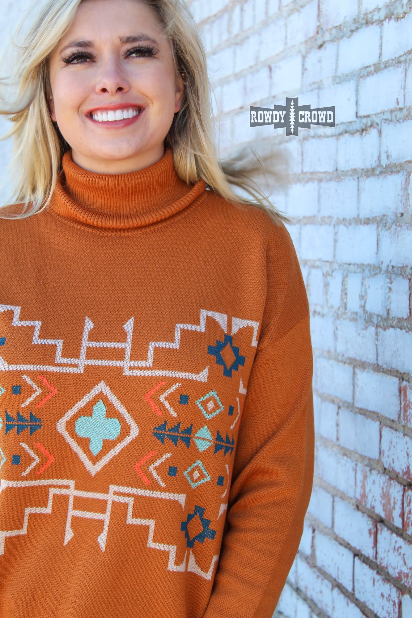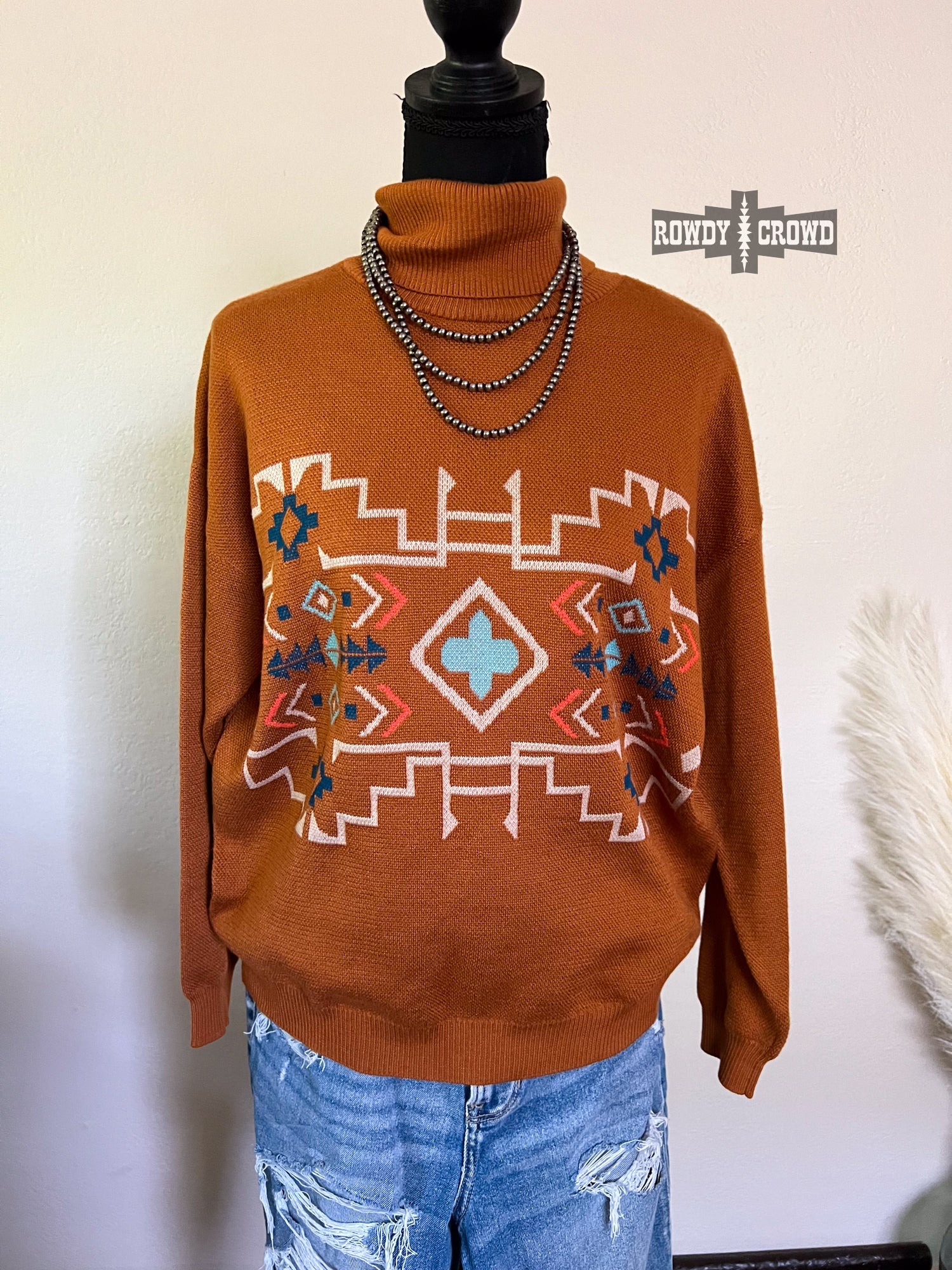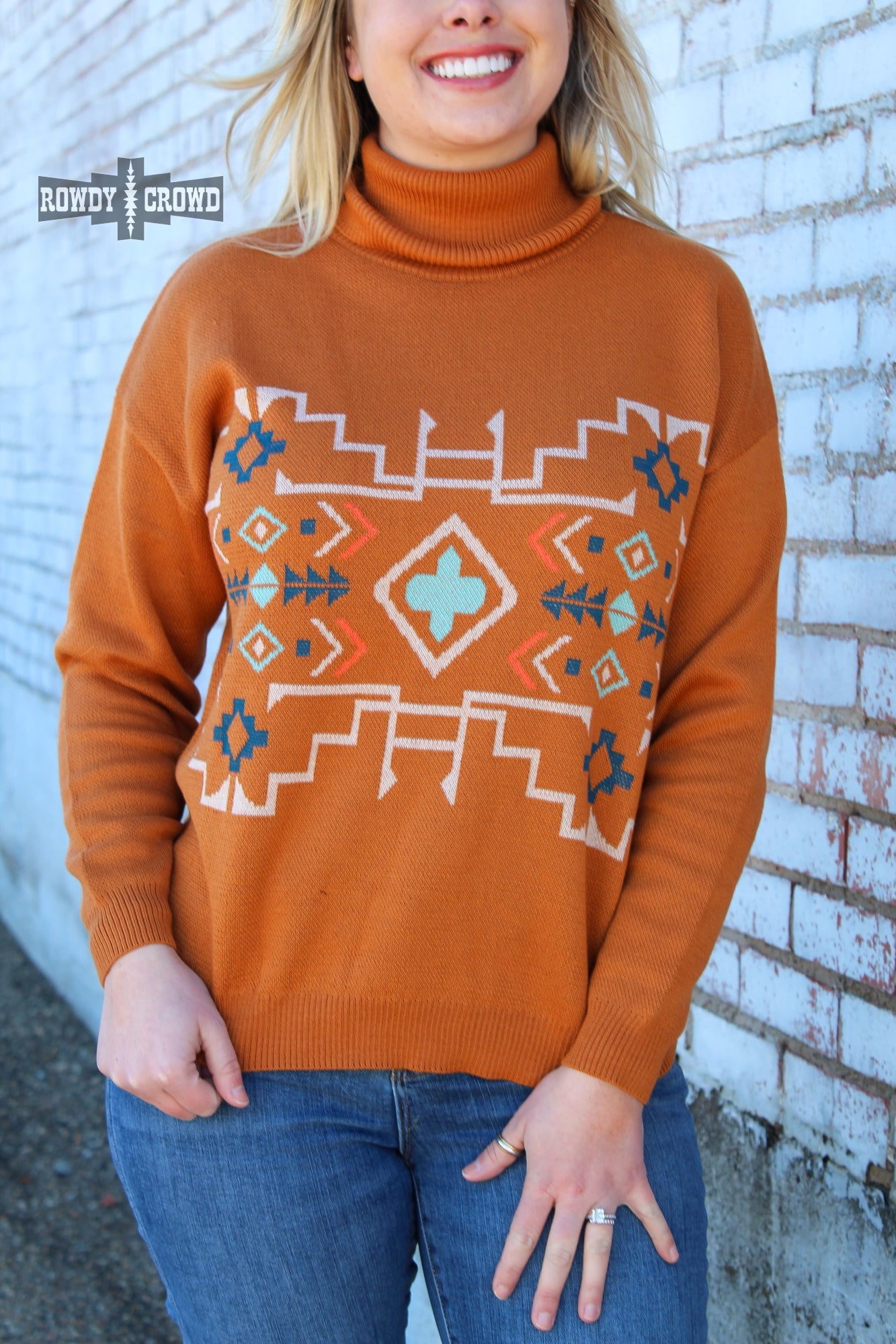 Step out in style with Tatonka's fashionable turtleneck sweater! Made from a soft, comfortable fabric, this brown turtle neck looks great and feels great too, with a bold cream, black, turquoise, and orange aztec design. Dare to look great and make a statement with Tatonka!