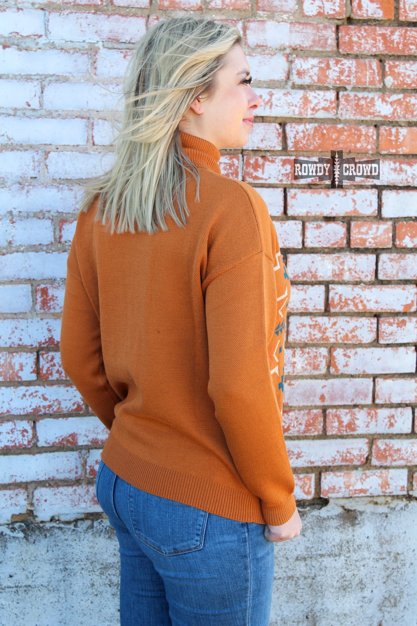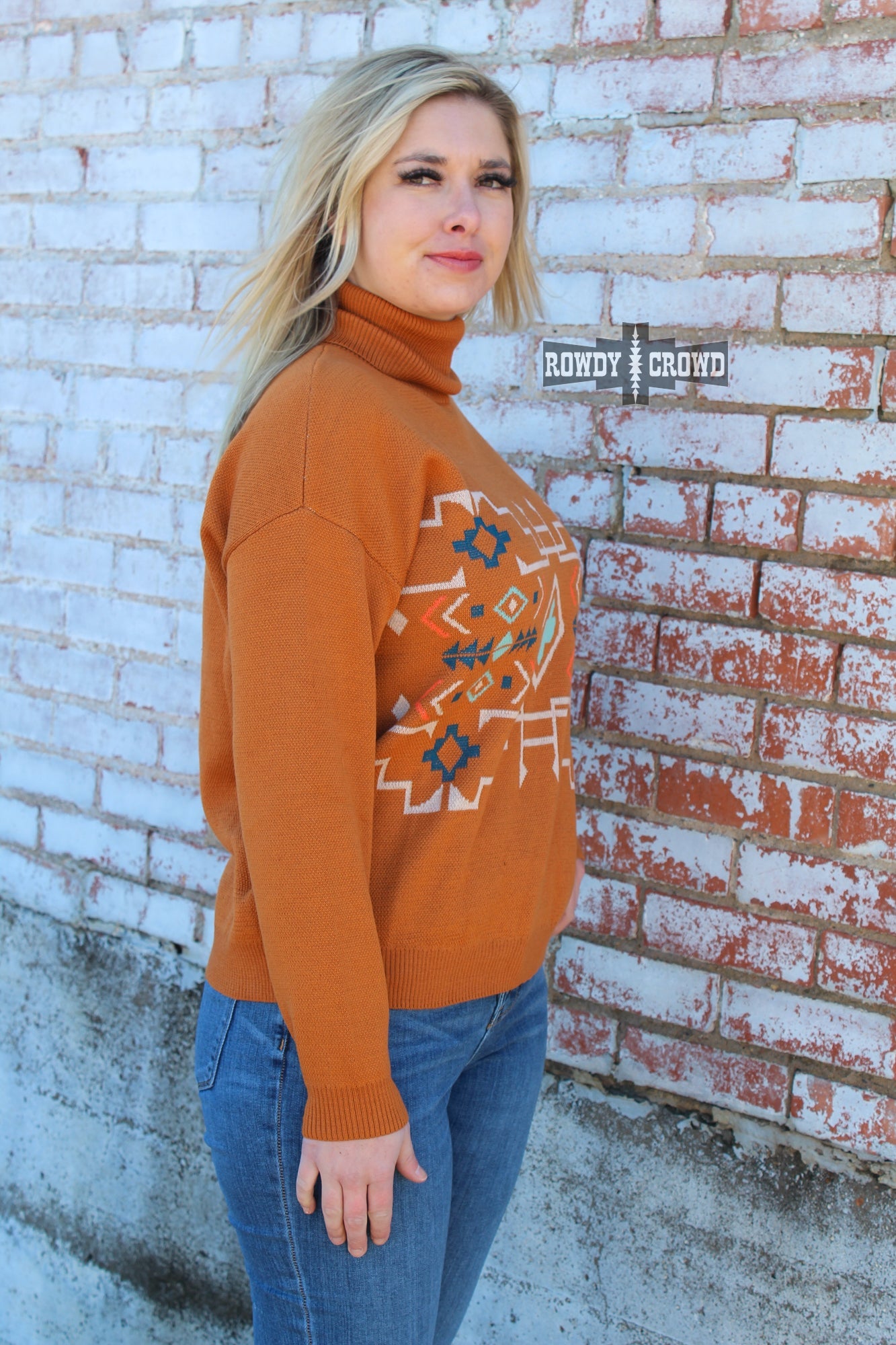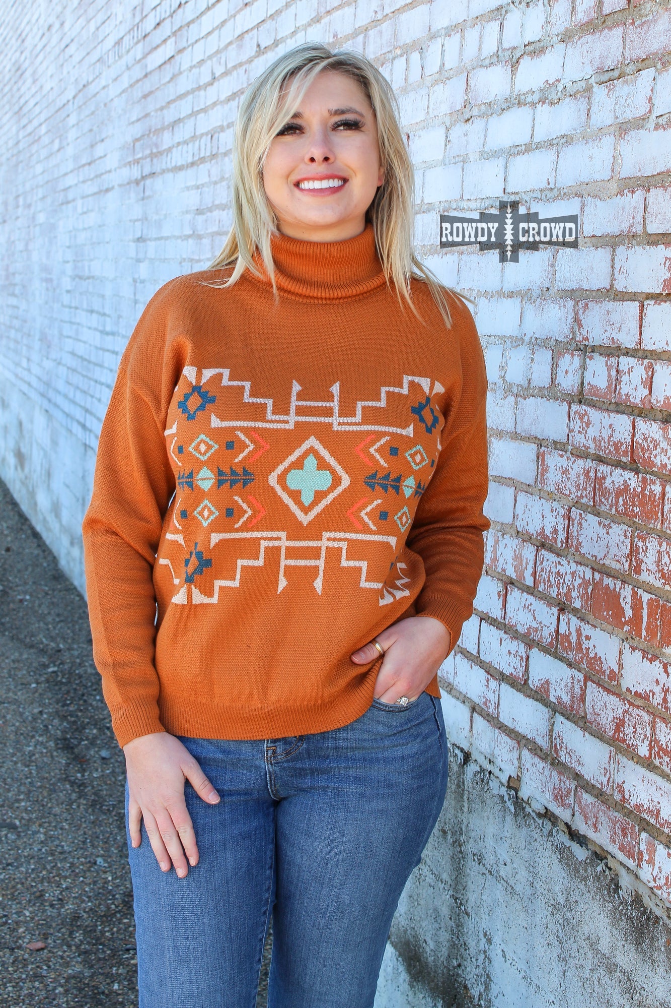 Step out in style with Tatonka's fashionable turtleneck sweater! Made from a soft, comfortable fabric, this brown turtle neck looks great and feels great too, with a bold cream, black, turquoise, and orange aztec design. Dare to look great and make a statement with Tatonka!