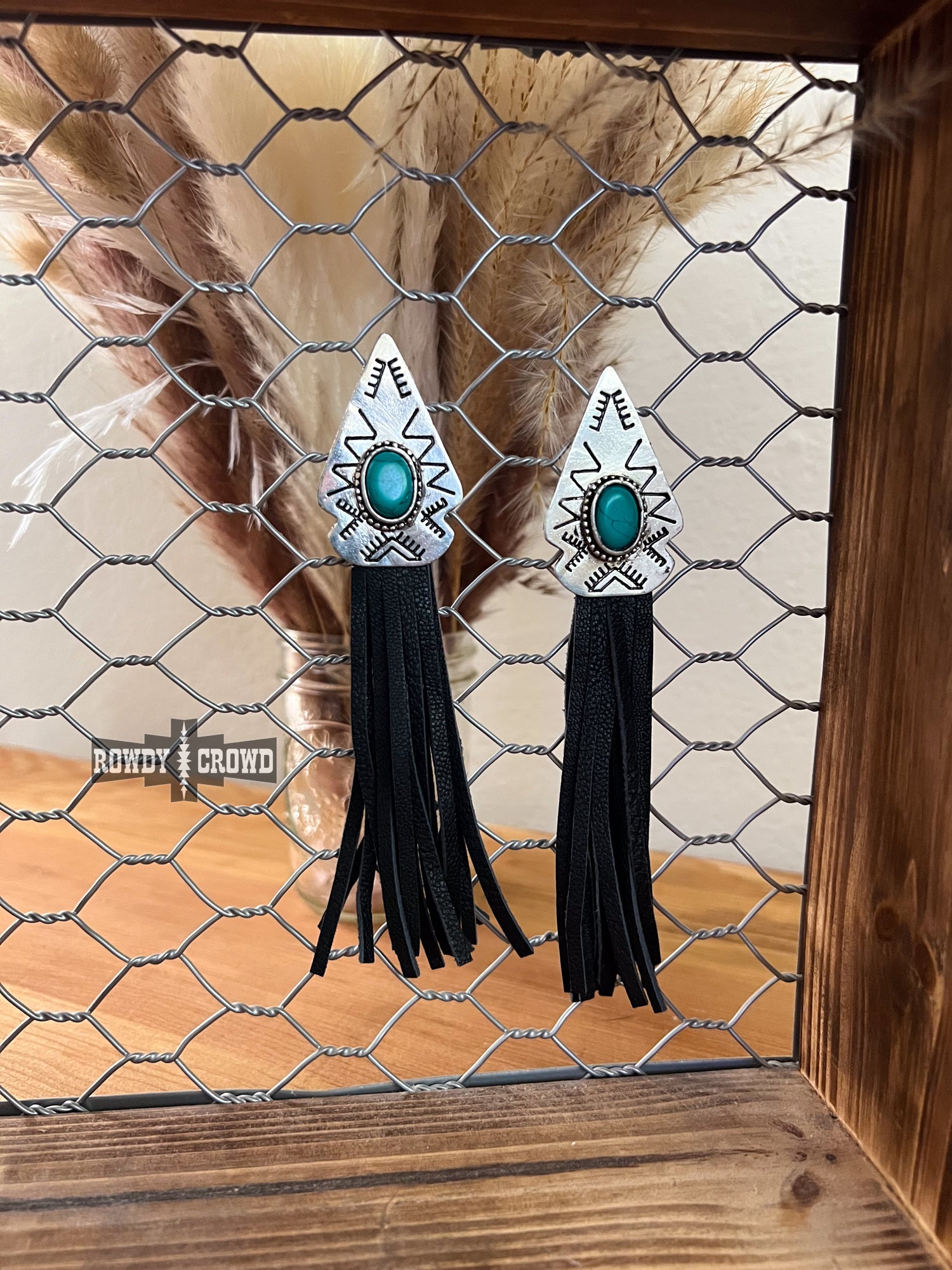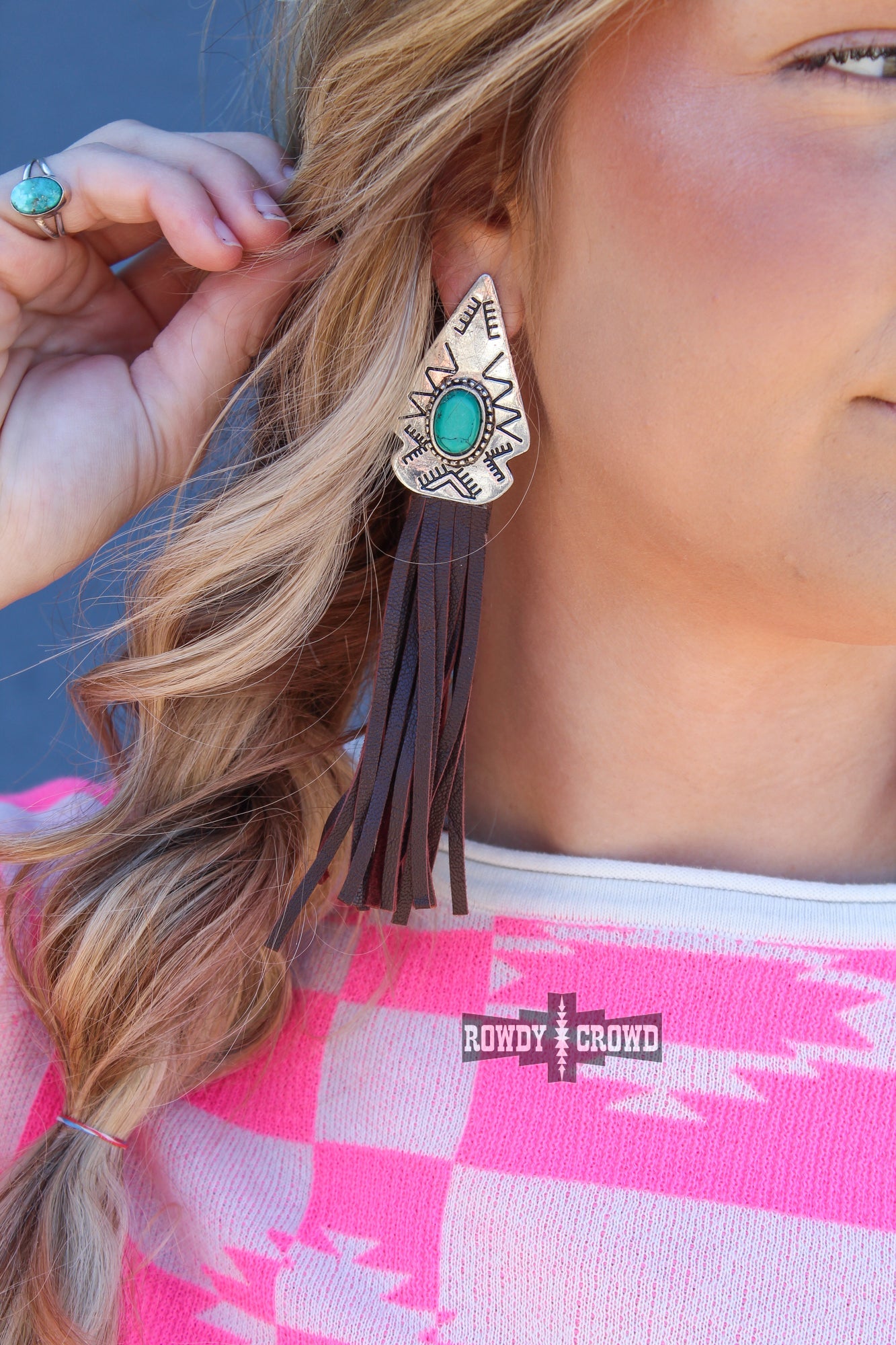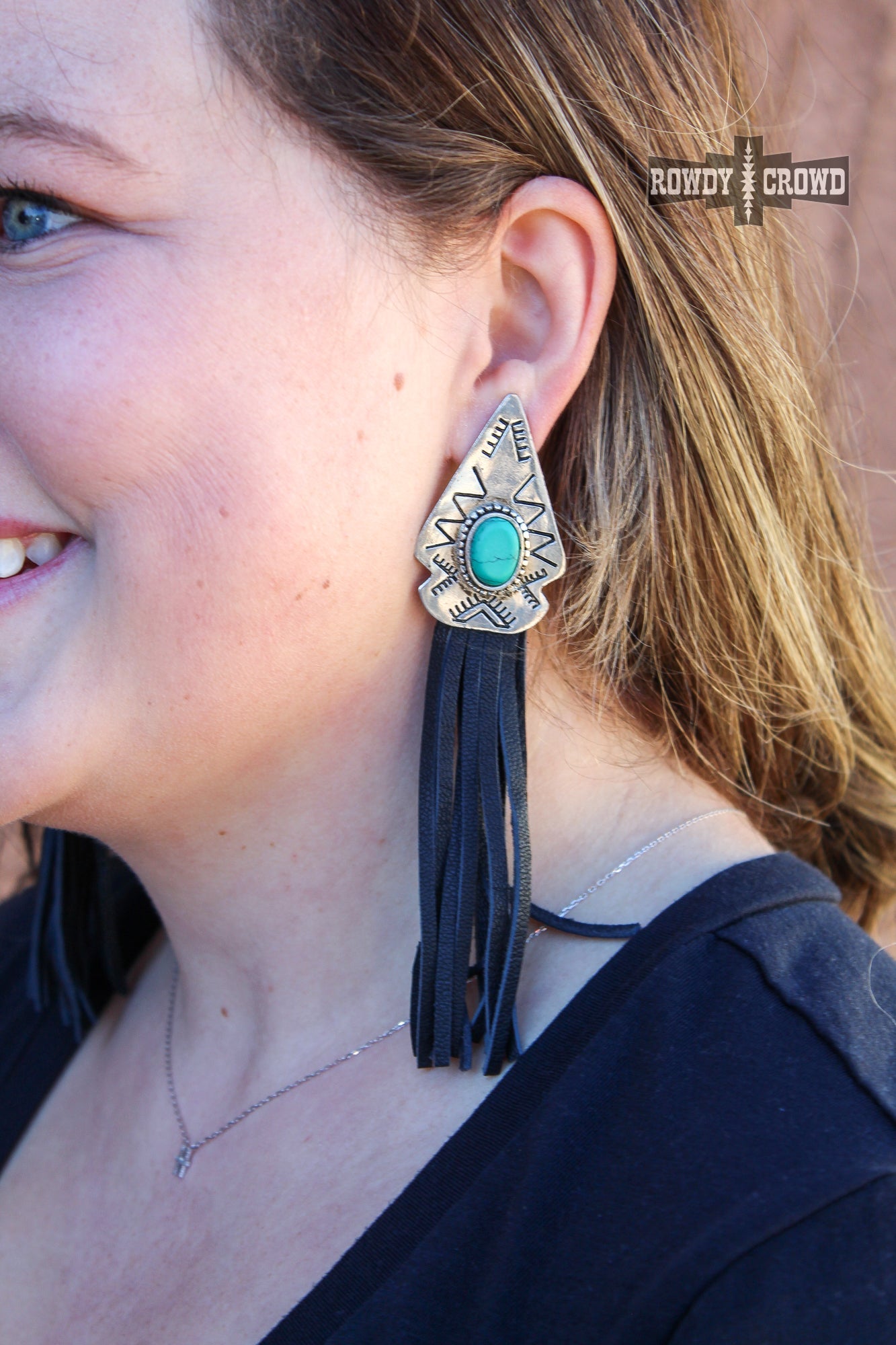 Add a touch of flare and western style to your look with the Thunder Rolls earrings. Crafted with an aztec engraved arrowhead, turquoise stone for an eye-catching contrast, and black or brown leather fringe, these earrings are perfect for everyday wear.