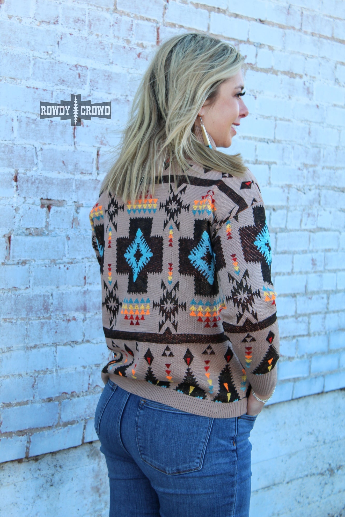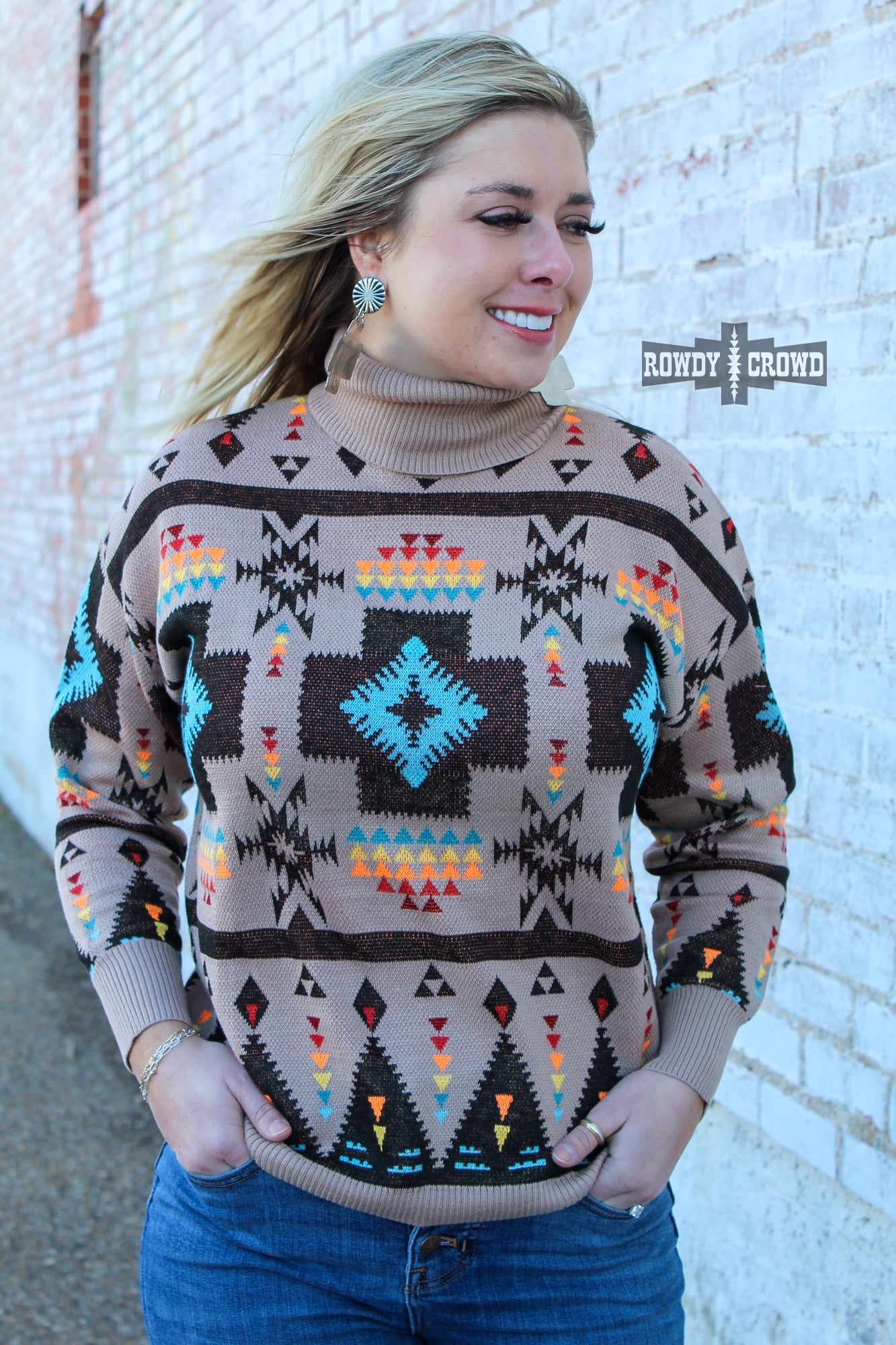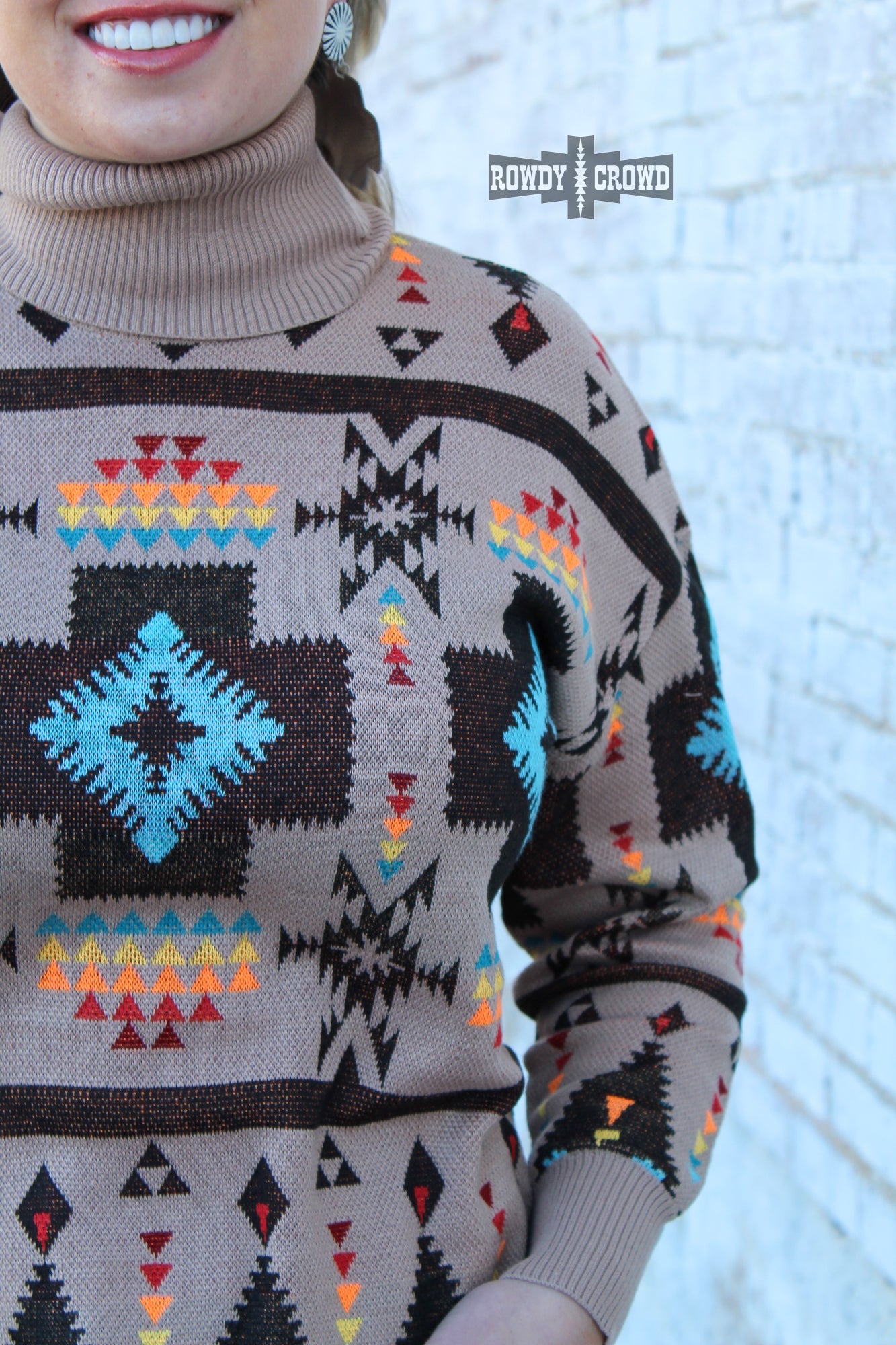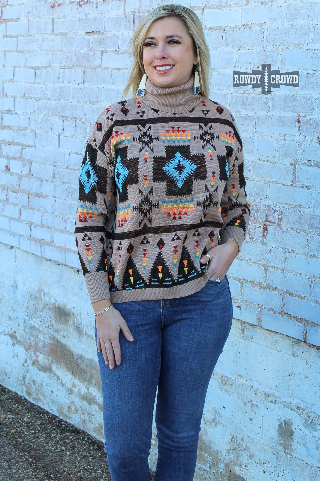 Stay warm and stylish wearing the Tombstone Turtleneck Sweater. This beautiful tan sweater is adorned with vibrant black and turquoise aztec designs with hints of red, orange, yellow, and blue details. Cozy and stylish - it can't get better than that!
