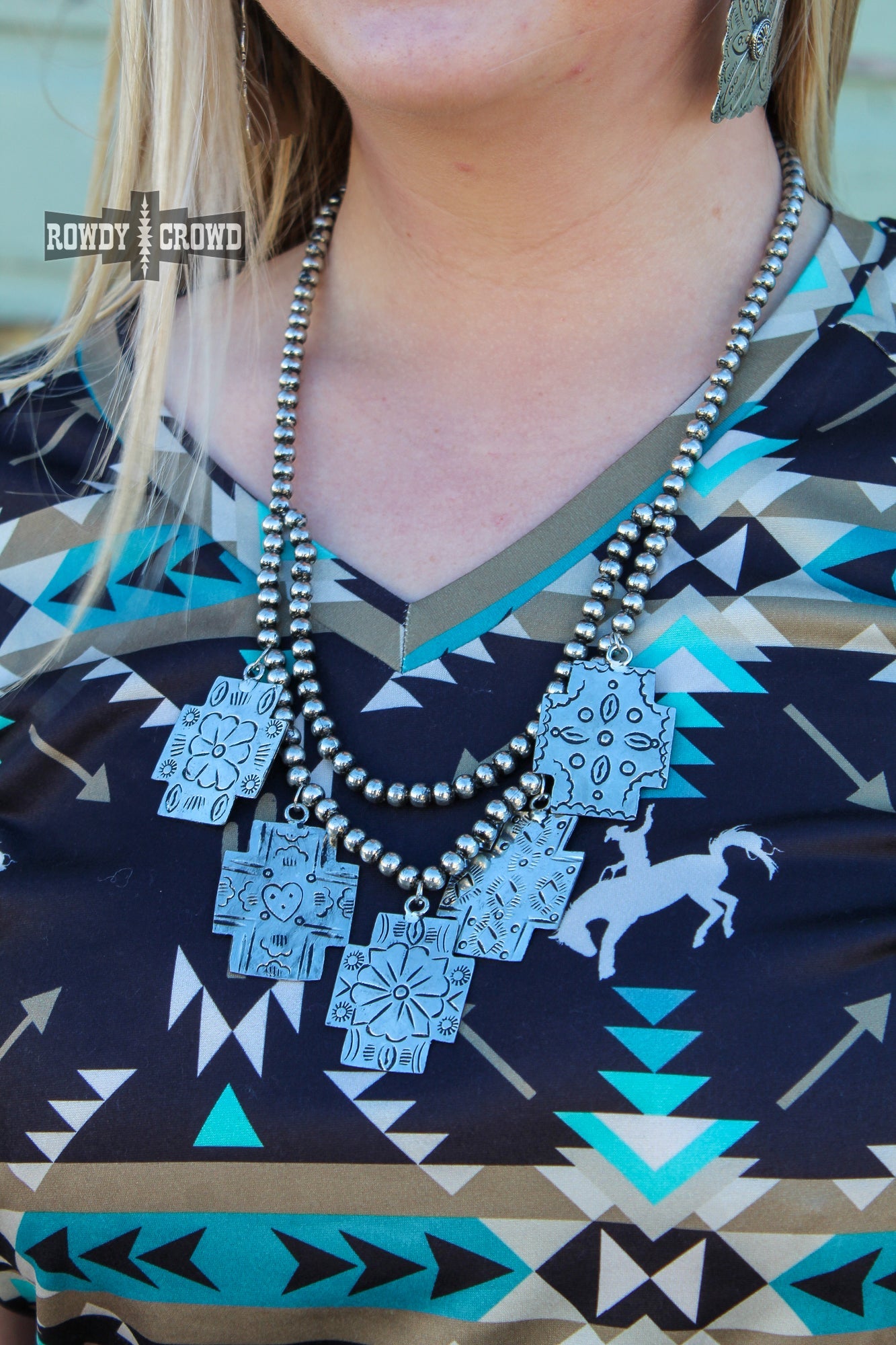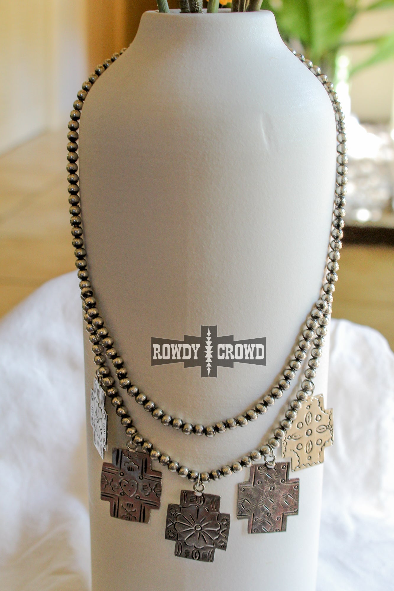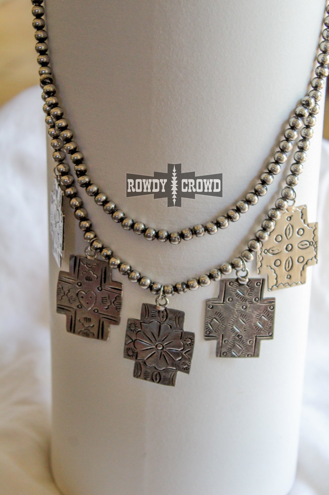 This Waverly Necklace celebrates beauty and style. Each striking cross pendant is carefully engraved with intricate details, creating a timeless piece of jewelry. Silver beaded layers, make this necklace stand out. An inspirational accessory that will become a cherished favorite.